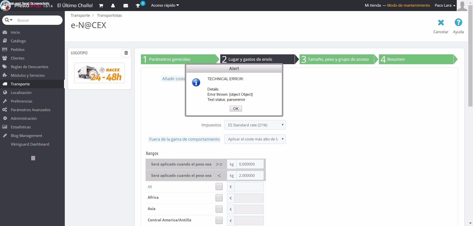 Yéchar Posted October 27, 2016 Share Posted October 27, 2016 Al intentar modificar un transportista me da el siguiente error: TECHNICAL ERROR Adjunto captura de pantalla. Alguien sabe cómo solucionarlo? Link to comment Share on other sites More sharing options...
