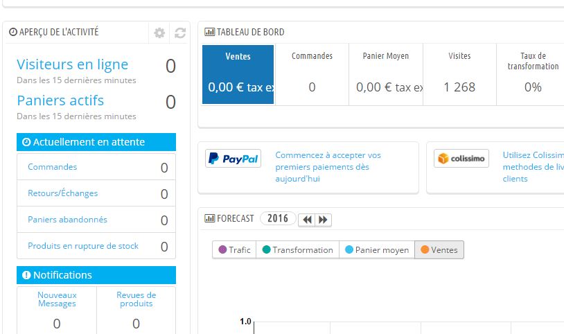 Dans l'apercu de l'activité tout est à 0 (visiteurs en ligne, paniers actifs, commandes, paniers abandonnés produits en rupture de stock, etc..)
