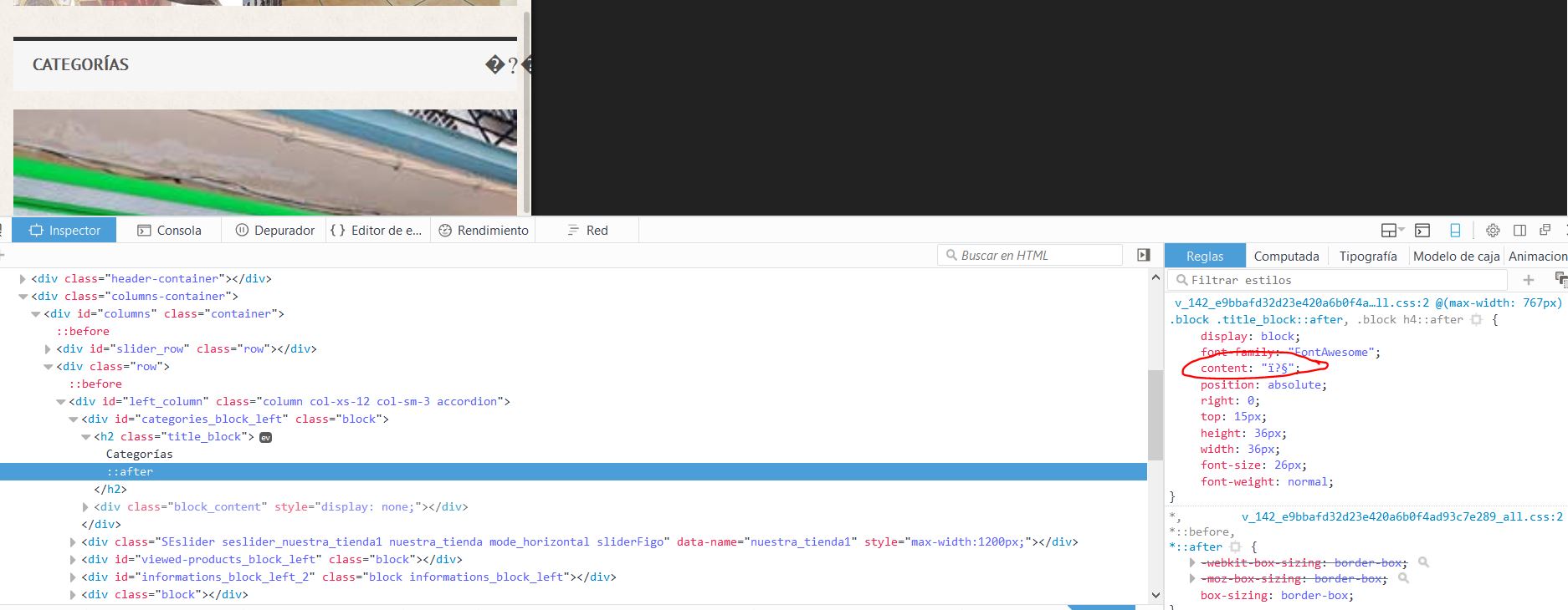 Buenas tardes, estoy experimentando problemas con los iconos font-awesome en las categorias de mi tienda, adjunto imágen para que lo podais ver, tanto visualmente como del inspector de código.