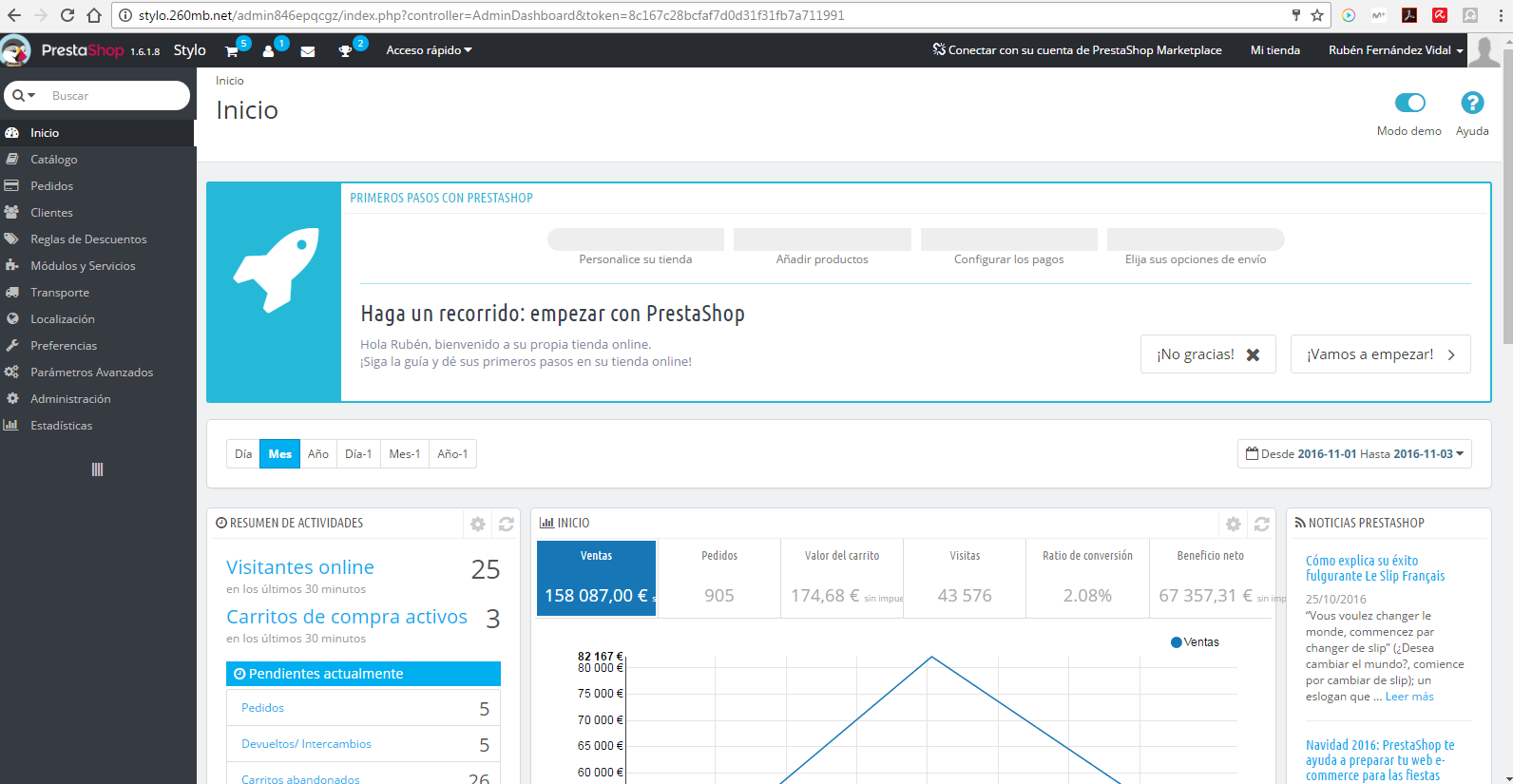neho23 Posted November 3, 2016 Share Posted November 3, 2016 Hola amigos, ayer me instale prestashop para emprender la aventura de una tienda online básica. He realizado todos los pasos siguiendo los tutoriales pero al acceder a mi panel de control tras meter los datos del login me sale una imagen fija llena de datos como si fuera una demo, pero no hay forma de salir de ella y no puedo hacer nada. Os adjunto una imagen para que lo veáis mejor... ¿quizás sea por el servidor en el que está alojada la web? Muchas gracias por vuestra ayuda. Link to comment Share on other sites More sharing options...