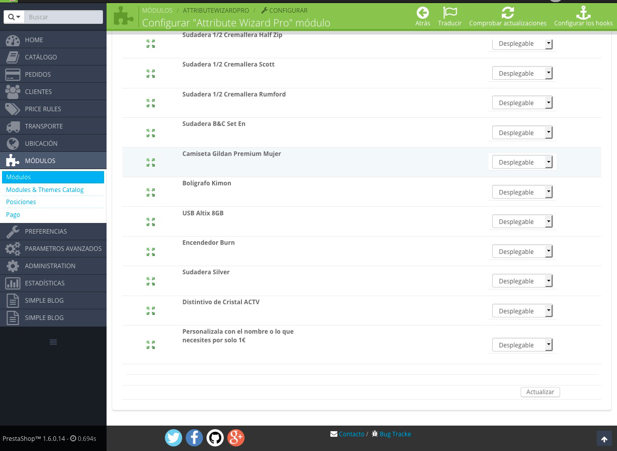 Nastin Posted November 3, 2016 Share Posted November 3, 2016 Buenas a todos, resulta que tenemos instalado el modulo Attribute Wizard Pro, el cual nos permite modificar la vista de los los atributos de los productos y nos da muchas posibilidades. A este modulo ya se le han realizado actualizaciones y modificaciones por algun usuario del foro en el pasado, ya que en algun momento a funcionado mal. En su ultima actualizacion el modulo parecia funcionar correctamente, pero ahora nos hemos modificar atributos y resulta que desde el propio panel de modulos la aplicacion fno funciona correctamtente y en vez de guardar los cambios lo que hace es desordenar la posición y caracteristicas de los atributos haciendo imposible aplicar cambios y dejar la web con el aspecto deseado. (Espero haberme explicado bien) Estoy buscando un programador que le pegue un repaso al modulo y lo haga funcionar correctamente, ya que el distribuidor de este modulo ya no nos da soporte. Quedo a la espera de recibir ayuda. Un saludo y gracias PD: Adjunto imagen de donde se produce el error Link to comment Share on other sites More sharing options...