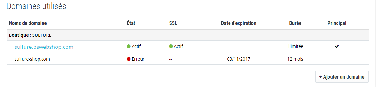 Sulfure Posted November 5, 2016 Share Posted November 5, 2016 Bonjour à tous,alors voilà je rencontre un soucis au niveau d'un nouveau nom de domaine que je viens d'acheter via prestashop,je m'explique: j'ai pris un nom de domaine qui est sulfure-shop.com,je le vois bien dans ma liste des noms de domaines actifs mais seulement je n'ai pas le ssl d'affiché et il est marqué en erreur avec un point rouge. J'ai contrôlé avec le site http://www.whois-raynette.fr/ et je vois bien mon nom de domaine apparaître avec mon IP de la boutique,avant de venir ici j'ai fait pas mal de recherches j'ai tenté pas mal de choses mais rien à arrangé mon problème. dans un deuxième temps sur le site raynette je vois que mon serveur est chez OVH (je rappel que j'ai acheté le nom de domaine à partir de prestashop je voudrais savoir si il faut que je fasse héberger ce nom de domaine ou si il est déjà hébergé,je joint une capture d'écran à mon poste. En vous remerciant de votre aide Link to comment Share on other sites More sharing options...