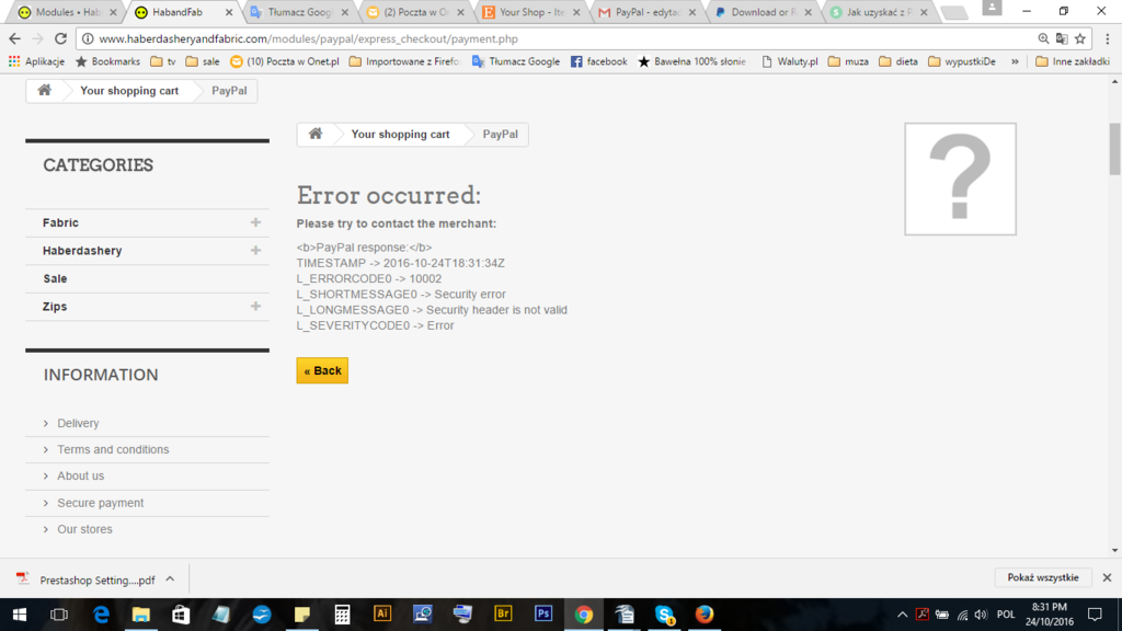 Co do modułu PayPal , to próbowałam odinstalować i zainstalować nowy i nic nie dało , jednej rzeczy nie mogę tam zmienić w tym module  , lokalizacja , jest cały czas na Polskę i nie mogę tego zmienić , może to o to chodzi ?