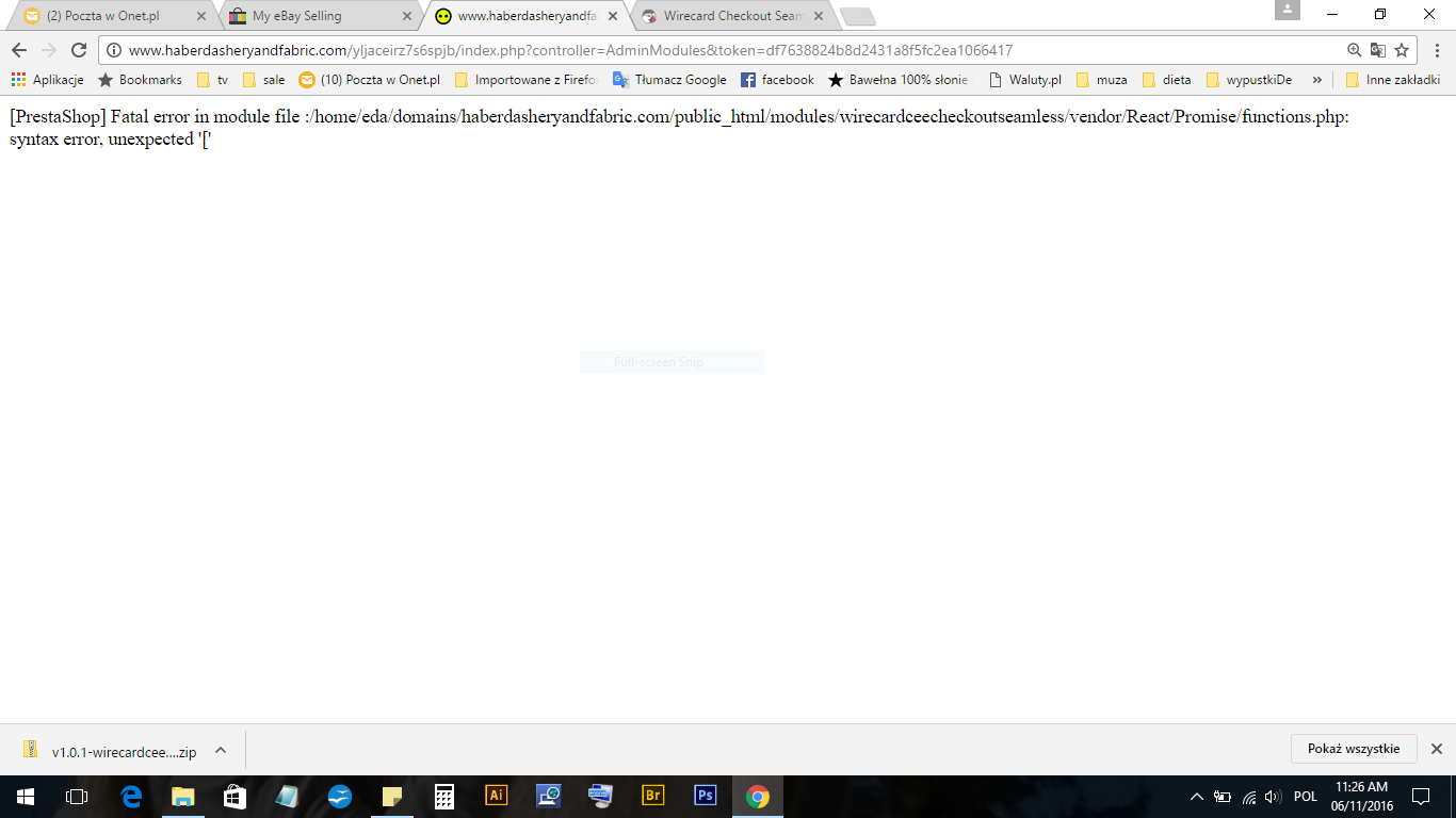 Próbowałam zainstalować moduł płatności WIRECARD i cos niedobrego sie wydarzyło ( załączam zrzut) w sekcji moduły biała strona i niestety nie można wrócić do listy modułów , wyświetla się tylko ta strona . Co się stało ? może ktoś wie?