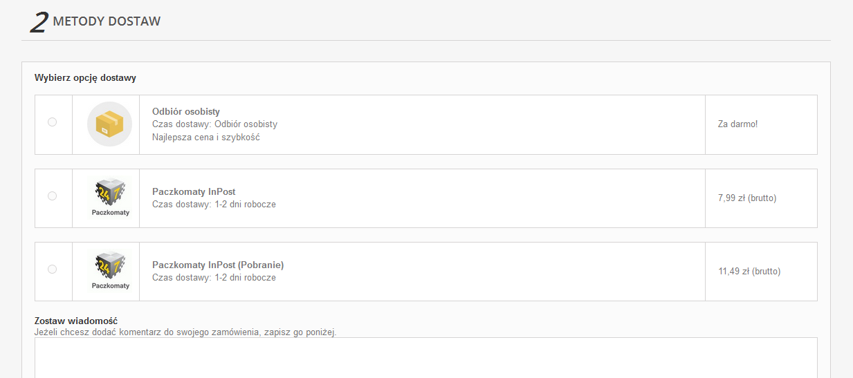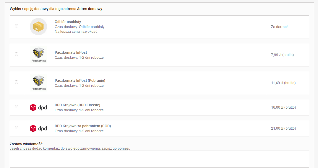 2. Kolejnym problemem jest to, że przed podaniem danych do wysyłki przy zakupach na jednej stronie widzę tylko 3 z 5 możliwych opcji odstaw. Po dodaniu adresy pojawia się dodatkowo DPD, które cały czas powinno być widoczne.