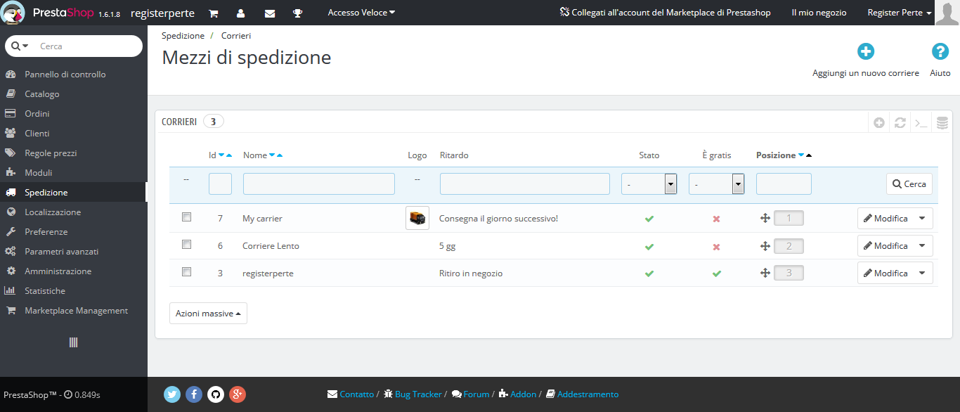 lennaz Posted November 8, 2016 Share Posted November 8, 2016 Ho configurato 3 metodi di spedizione per prestashop (1.6.1.8) - Ritiro in negozio - Gratuito - Corriere Rapido - 5 eur- Corriere Normale - 2 eur Sono abilitati per la nazione e per il gruppo con cui sto facendo il test; al quarto step del checkout (quello della scelta del corriere) mi viene mostrato solo un corriere; il corriere e' solo il primo in base all'ordinamento scelto in spedizione -> Preferenze e non c'e' possbilità di passare da un corriere all'altro. E' la prima volta che mi succede una cosa del genere, prestashop e' stato appena installato, non ci sono moduli particolari qualche idea? Link to comment Share on other sites More sharing options...