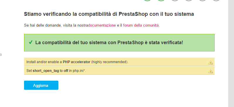 ClaudiaG Posted November 8, 2016 Share Posted November 8, 2016 Ciao a tutti! Il mio isp "Keliweb" dice che il mio spazio è ottimizzato per prestashop 1.7, ho la versione 5.5 di php ma durante l'installazione mi compaiono dei messaggi come da oggetto. Cosa devo fare per attivare i giusti settaggi? Purtroppo Keliweb non mi assiste in questo...altro che ottimizzato per prestashop! (ed è pure caro e salato!) Allego screenshot, Grazie! Ciao Claudia Link to comment Share on other sites More sharing options...