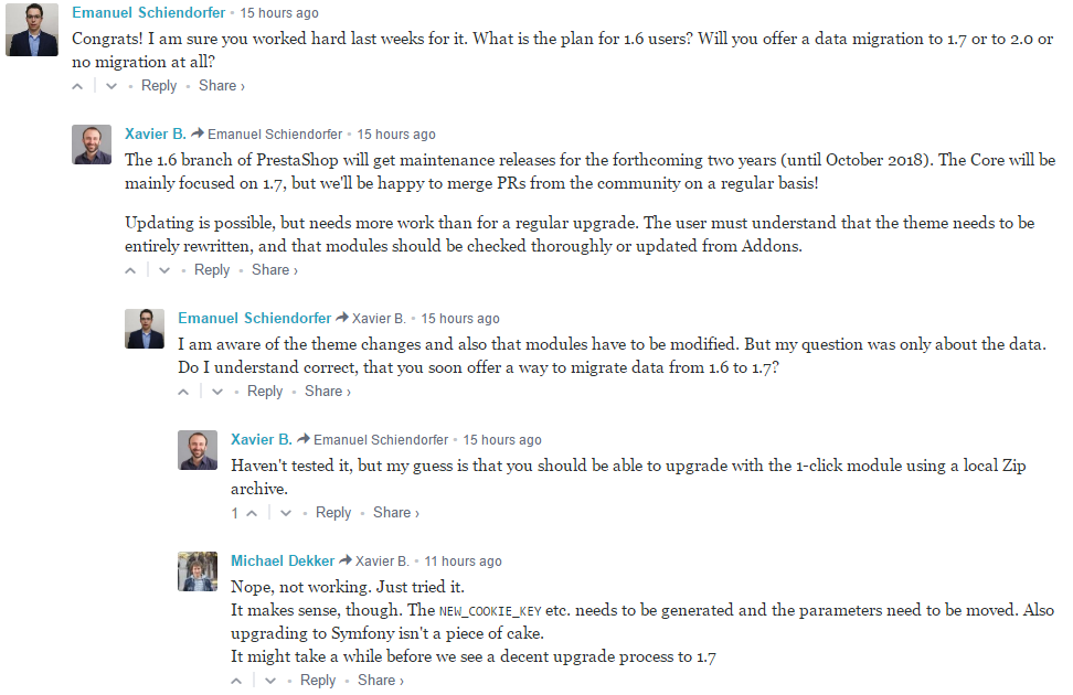 Lausli Posted November 14, 2016 Author Share Posted November 14, 2016 Ich habe geschrieben auf absehbare Zeit. Nicht, dass es das nie oder nicht geben wird. Die Informationen habe ich mir aus dem Forum gezogen. zB. Hier: https://www.prestashop.com/forums/topic/566247-upgrade-prestashop-16-to-17/ https://www.prestashop.com/forums/topic/566247-upgrade-prestashop-16-to-17/?do=findComment&comment=2438320 Link to comment Share on other sites More sharing options...