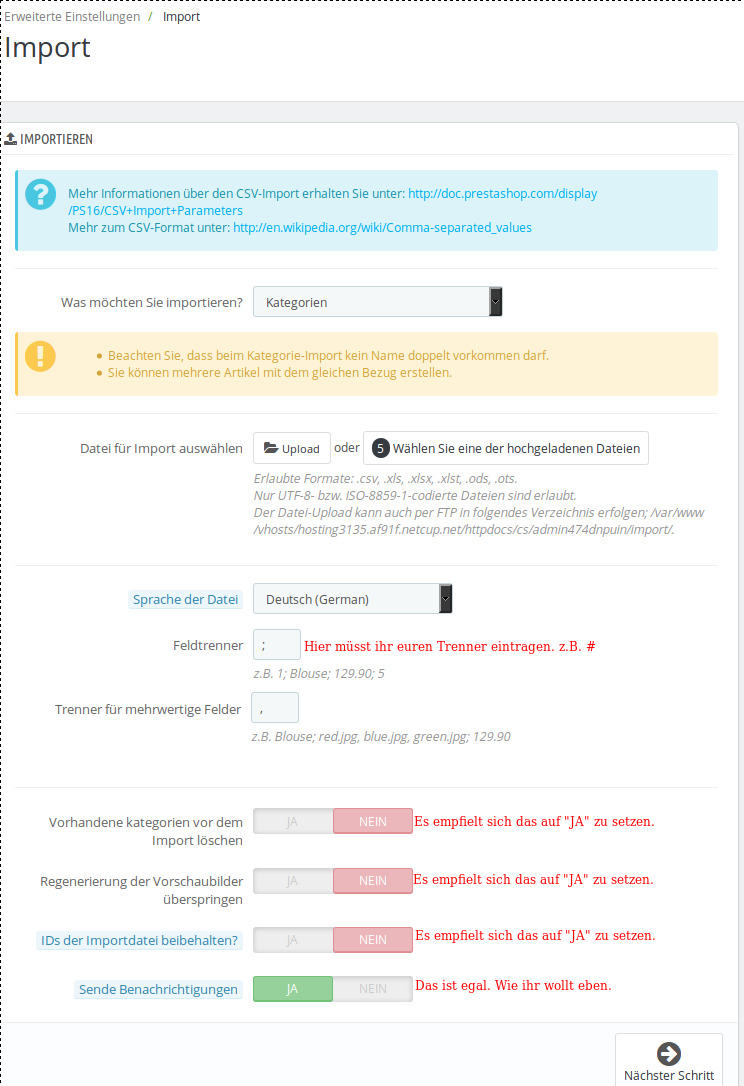 Lausli Posted November 11, 2016 Share Posted November 11, 2016 (edited) Hallo Leute, ich möchte eine Möglichkeit erklären, wie ich nach dem Minimalprinzip zur Lösung kommen kann. Was brauchst du für Grundvoraussetzungen? Etwas Erfahrung mit Servern Fehlermeldungen einschalten Fehlermeldungen lesen und verstehen Im besten Fall einen zweiten ServerEmpfohlen 2 rootserver Eine Möglichkeit Artikel und Kategorien zu exportieren Export Pro - Products, Combinations, Orders, etc. Modul (35,69 € Inkl. MwSt.) How to export products in PrestaShop 1.6 with all the fields supported by CSV Import Eine Prestashop 1.6.1.6-9 und eine Prestashop 1.7.0.0 Installation (am besten auf 2 Servern) Der Prestashop 1.6.x Server ist hier der Produktive Server. Da verändern wir nix! Prestashop 1.7.0.0 kann ein kleinerer Server sein! Der Import ist nicht mehr von der execution_time abhänig! Daher kann der etwas kleiner ausfallen Wie man Prestashop 1.7.0.0 installiert habe ich hier mal kurz angerissen.Bedenkt bitte dabei, das die Warnung des php accelerator nur eine Warnung ist. Das ist ein Beschleuniger. Der ist "dringend" empfohlen aber nicht notwendig! Euren 1.6.x Server bezeichnen wir hier als Server ADen 1.7.x als Server B Ich nutze erst mal Export Pro:Also exportiere ich alle Kategorien und Produkte erst mal in eine .csv Datei Erweiterte Einstellungen > Export Pro Als Delimiter habe ich die Raute (#) gewählt, weil mir default das Komma (,) nicht so recht zugesagt hat.Das ganze macht ihr auch mit den Kategorien. nun habt ihr 2 .csv Dateien und könnt diese entweder nochmal per Calc oder Excel bearbeiten oder es so lassen. Das war es schon mit dem Export.Hinweis: Die Bilder, bleiben auf Server A! Der Export verlinkt die Bilder auf Server A.Das heißt, wenn eure Domain www.ServerA.de ist, steht im Export als urlWollt ihr auch die Bilder auf Server B haben müsst ihr den Ordner/img/p/auf euren Server B kopieren. Jetzt kommt der Import.Dazu öffnet ihr euren Server B und loggt euch ein.Anschließend findet ihr dem Import hier: Configure > Erweiterte Einstellungen > Import Nun geht es zum neuen Import:Das neue an diesem Import: Er validiert eure .csv und gibt eine akzeptable Meldung aus die euch bei der Fehlersuche hilft Er ist nicht mehr von der execution_time eures Server abhängig. Das war es an sich auch schon. So zumindest der aktuelle Stand. Gleichermaßen könnt ihr mit der Lösung von http://premiumpresta.com/blog/export-products-for-csv-import-prestashop-1-6/ verfahren. Nur das der Export dann auf die Artikel beschränkt ist und das ihr den Export dann über Katalog > Produkte stattfindet. Hinweise: Ein 1-Click-Upgrade wird es auf absehbare Zeit wohl nicht geben Prestashop 1.7.0.0 ist nicht Stabil und für den Produktiven Einsatz gedacht! Viel Spaß Edited November 11, 2016 by Lausli (see edit history) Link to comment Share on other sites More sharing options...
