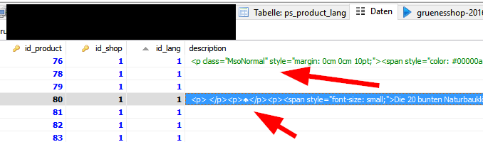 BoKr Posted November 11, 2016 Share Posted November 11, 2016 At the point in time when we started with Prestashop we had product descriptions prewritten in MS Word. We then copied the text into Prestashop. This was no good practice. Now I have problems to clear html markup or code. When I do a SQL export then this markup is not exported. I can see it via Prestools/Tripleedit or directly in the DB. Worse, Google (Shopping) can see it too. So, I need to clean it. Best via batch or search & replace. examples <p class="MsoNormal" style="margin: 0cm 0cm 10pt;"><span style="color: #00000a;"><span style="font-family: 'Arial','sans-serif'; mso-bidi-font-family: Mangal;">Doppelstö...</span><!--?xml:namespace prefix = o ns = "urn:schemas-microsoft-com:office:office" ?--></span></p> <p class="MsoNormal" style="margin: 0cm 0cm 10pt;"><span style="color: #00000a;"> </span></p> <p class="MsoNormal" style="margin: 0cm 0cm 10pt;"><span style="font-family: 'Arial','sans-serif'; mso-bidi-font-family: Mangal;"><span style="color: #00000a;">Ein w.....</span></span></p> or <p> </p> <p></p> <p><span style="font-size: small;"> mh have a loot at the screenshot attached please: Link to comment Share on other sites More sharing options...