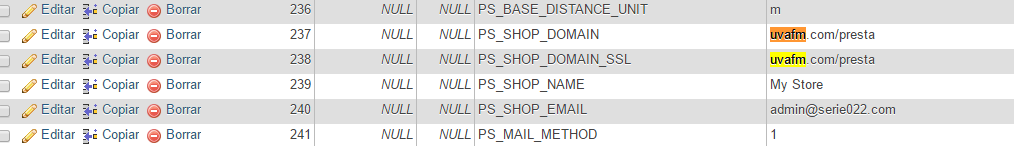 Hola, estoy intentando cambiar directorio de instalacion de una tienda en prestashop se encontraba instalado en un dominio adicional en mi hosting el cual es serie022.com/prestay ahora el dominio al cual lo he llevado es el principal pero dentro de un directorio uvafm.com/presta en la base de datos cambie los parametros PS_SHOP_DOMAIN y PS_SHOP_DOMAIN_SSL como muestra en la imagen adjunta, pero esto no me funiona sigue redireccionando al dominio serie022.com/presta