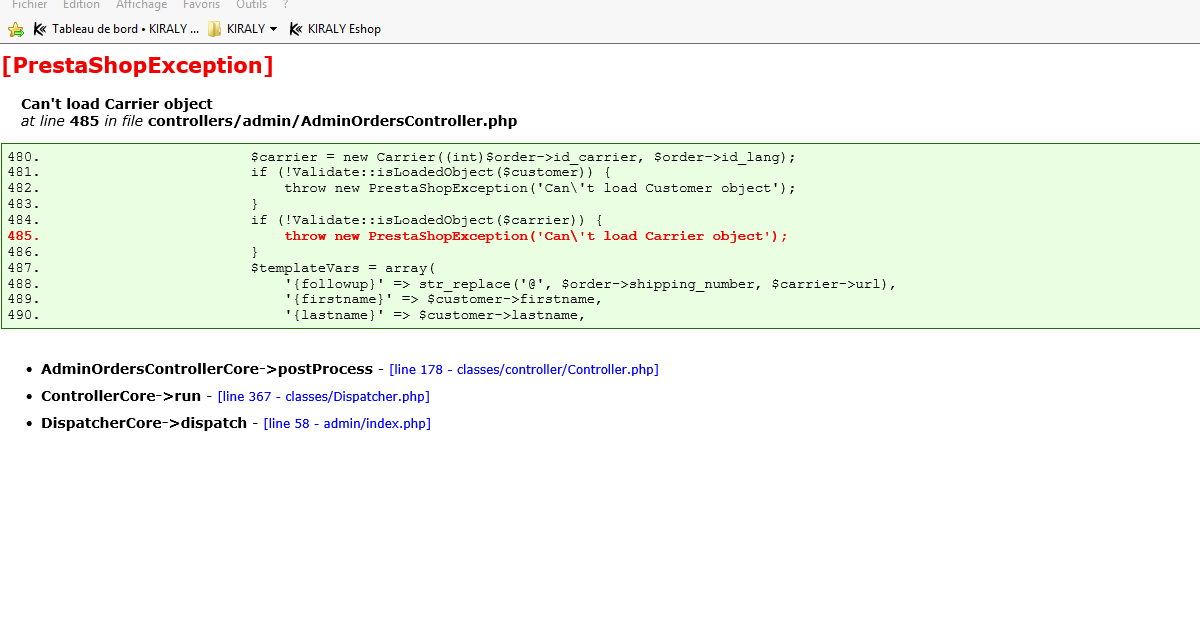 KIRALY Posted November 15, 2016 Share Posted November 15, 2016 Bonjour à tous, Pouvez-vous me traduire ce message suite à l'insertion d'un numéro de suivi colissimo sur une commande client s'il vous plait ? [PrestaShopException]Can't load Carrier objectat line 485 in file controllers/admin/AdminOrdersController.php 480. $carrier = new Carrier((int)$order->id_carrier, $order->id_lang);481. if (!Validate::isLoadedObject($customer)) {482. throw new PrestaShopException('Can\'t load Customer object');483. }484. if (!Validate::isLoadedObject($carrier)) {485. throw new PrestaShopException('Can\'t load Carrier object');486. }487. $templateVars = array(488. '{followup}' => str_replace('@', $order->shipping_number, $carrier->url),489. '{firstname}' => $customer->firstname,490. '{lastname}' => $customer->lastname, AdminOrdersControllerCore->postProcess - [line 178 - classes/controller/Controller.php]173. if (!$this->content_only && ($this->display_header || (isset($this->className) && $this->className))) {174. $this->setMedia();175. }176. 177. // postProcess handles ajaxProcess178. $this->postProcess();179. 180. if (!empty($this->redirect_after)) {181. $this->redirect();182. }183. ControllerCore->run - [line 367 - classes/Dispatcher.php]362. if (isset($params_hook_action_dispatcher)) {363. Hook::exec('actionDispatcher', $params_hook_action_dispatcher);364. }365. 366. // Running controller367. $controller->run();368. } catch (PrestaShopException $e) {369. $e->displayMessage();370. }371. }372. DispatcherCore->dispatch - [line 58 - admin/index.php] (capture en pièce jointe) Merci d'avance ;-) Lucie Link to comment Share on other sites More sharing options...