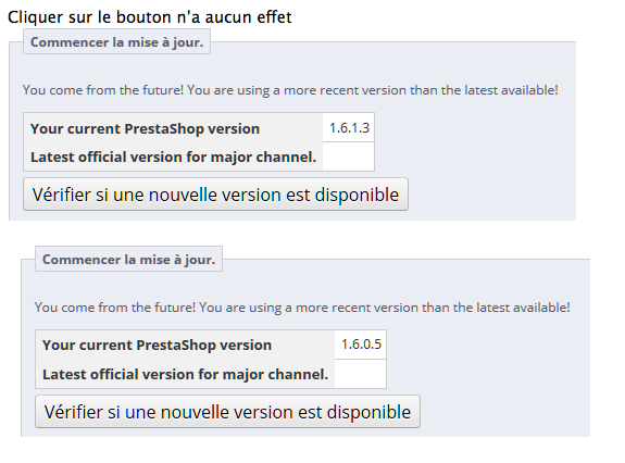 pretaboule Posted November 16, 2016 Share Posted November 16, 2016 Bonsoir lorsque j'essaie de faire la mise à jour de 1.6.0.5 vers la 1.6.1.3 et j'ai ce message de la part du module mise à jour en 1 clic Vous venez de l'avenir! Vous utilisez une version plus récente que la dernière disponible! Même manuel ça ne fonctionne pas .. comment faire ? Merci si quelqu'un à une idée ? Link to comment Share on other sites More sharing options...