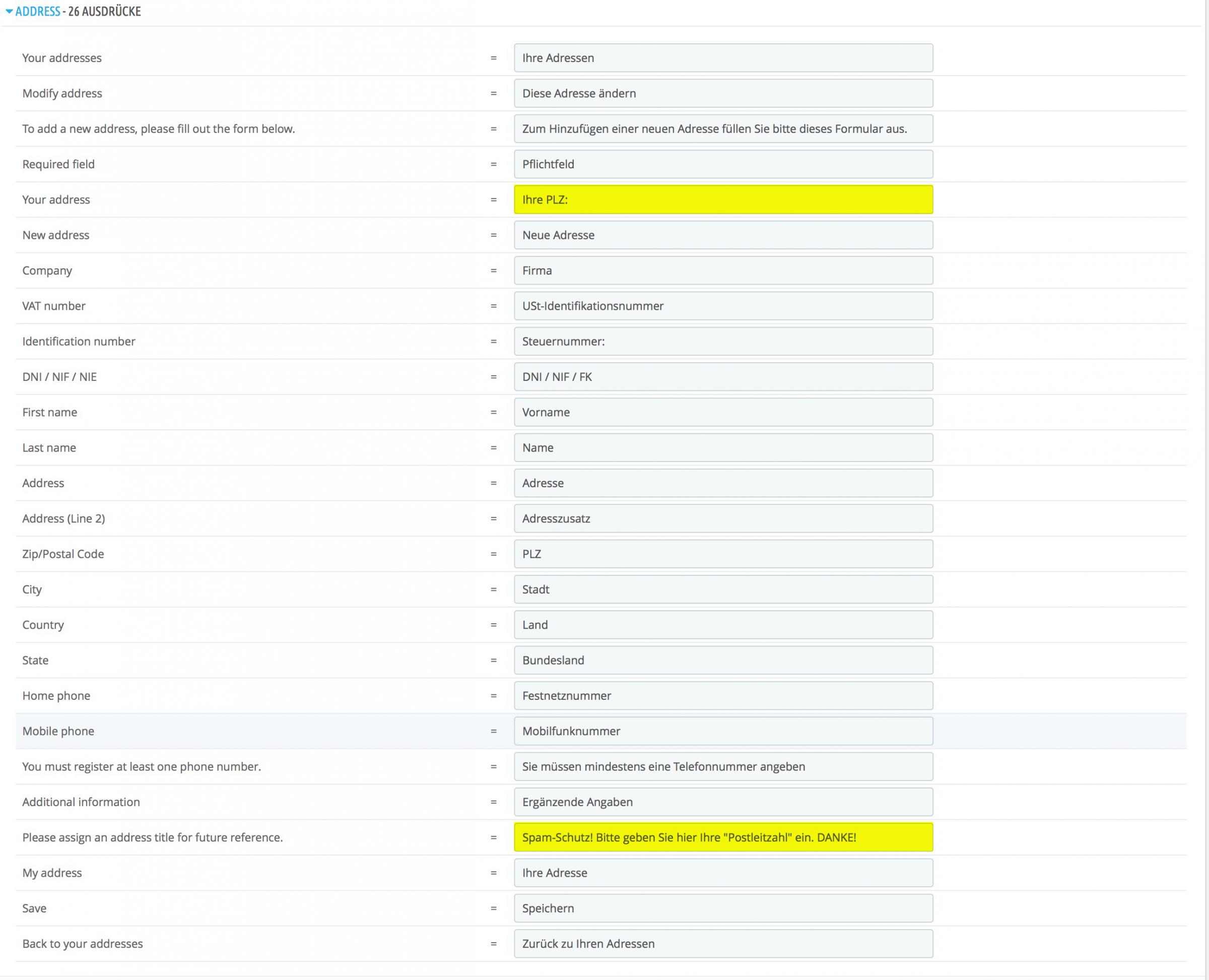 Wolke7 Posted November 18, 2016 Author Share Posted November 18, 2016 So habe mal in den Übersetzungen nachgeschaut, und da gibt es ja 2 Felder welche dafür Zuständig sein müssten. Ich habe diese mal im Anhang Gelb eingefärbt, damit man es schneller sieht welche ich meine. Liege ich da richtig? Und ich denke wenn ich dies Feld als Spam-Schutz formuliere füllt das auch jeder so aus und bricht den Kauf deswegen auch nicht ab. Link to comment Share on other sites More sharing options...