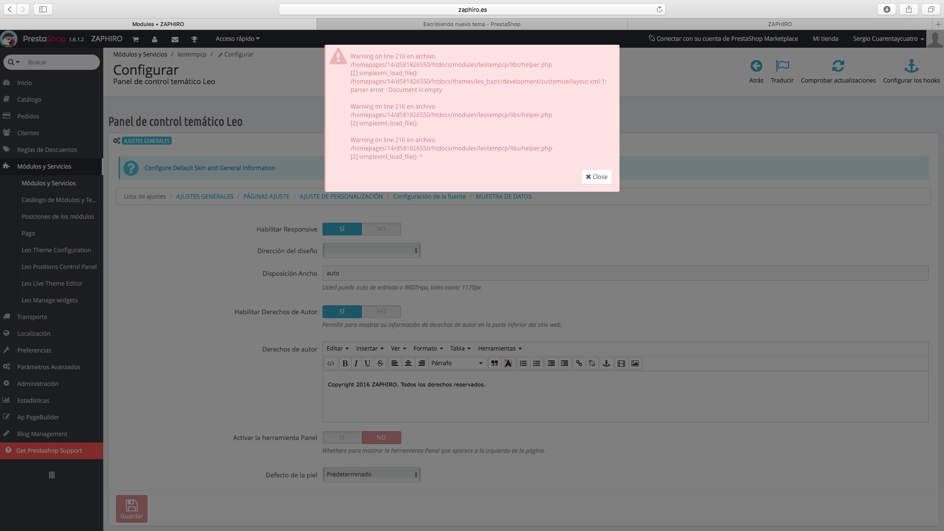 Además casualmente al acceder a la configuración del tema (Leo Theme) también me sale este mensaje de error en el backoffice: