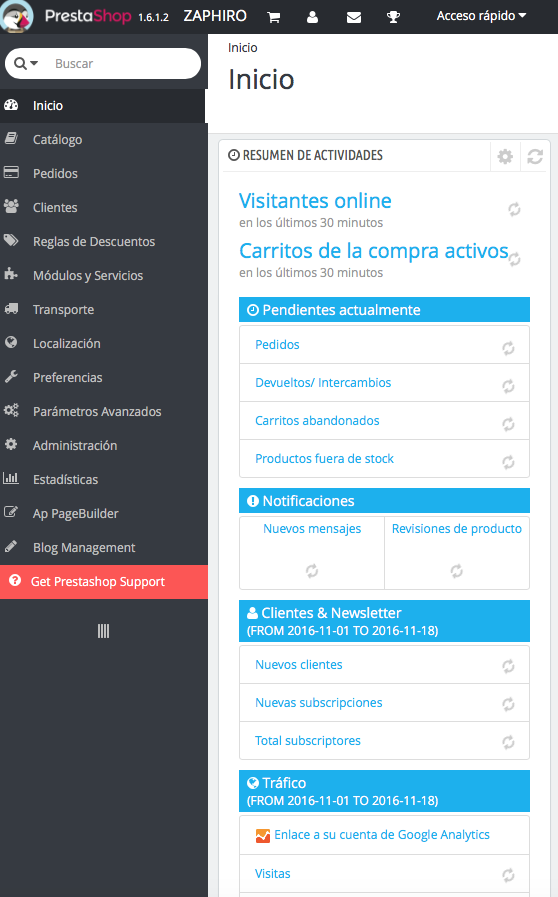 Y para rematar por si fuera poco y como dato curioso, en el backoficce en la pantalla de inicio, en el resumen de actividades no se cargan los datos y los circulitos con las flechas dan vueltas sin parar.