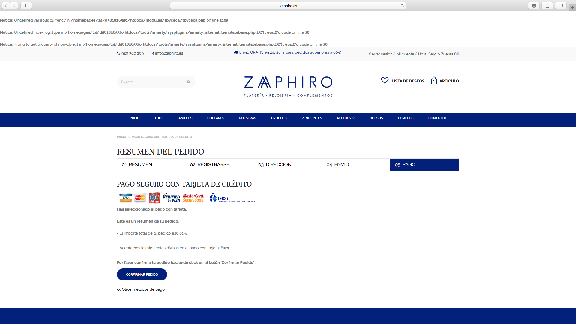 Al realizar una prueba realizando yo mismo una compra, al llegar a la pantalla de pago/resumen del pedido podreis ver en los adjuntos que salen los siguientes errores en la parte superior del front: