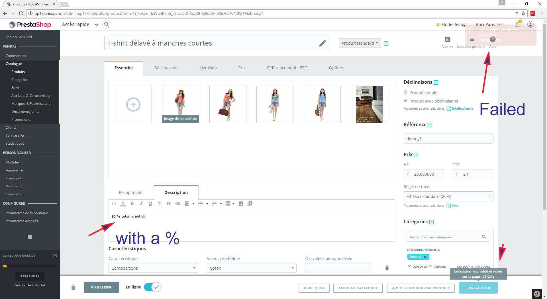 caojianhua2002 Posted November 19, 2016 Share Posted November 19, 2016 Hello, Could any give me an idea on this problem : I've installed 2 different versions of Prestashop 1.25 and 1.7 on the same hosting server : Version du logiciel serveur : Apache Version de PHP : 5.6.25 Version de MySQL : 5.6.33 And I have the same problem on both versions. If I put a "%" in any of the description of the product, it's then impossible to update the product. Attached is the screen copy of the operation, the one with "90 percent coton is ok" the second with "90 % coton is not ok" Thanks your help. Jianhua Link to comment Share on other sites More sharing options...