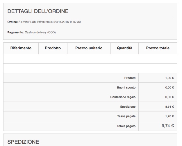 loriste Posted November 20, 2016 Share Posted November 20, 2016 (edited) Buongiorno a tutti. Ho un problema con la Mail che viene inviata dopo aver effettuato l'ordine, quella che dovrebbe contenere il riassunto dell'ordine. Praticamente non mi visualizza i dettagli di ogni singolo prodotto (riferimento, prodotto, prezzo unitario, quantità) e nemmeno le immagini dei prodotti. Ho controllato sulle impostazione del file ord_conf.html e risulta tutto ok. ( {product} e {discount} sono nel posto giusto ma è come se non prendesse quei comandi al momento di inviare il riassunto dell'ordine) Allego una foto di come arriva la Mail grazie Edited November 20, 2016 by loriste (see edit history) Link to comment Share on other sites More sharing options...