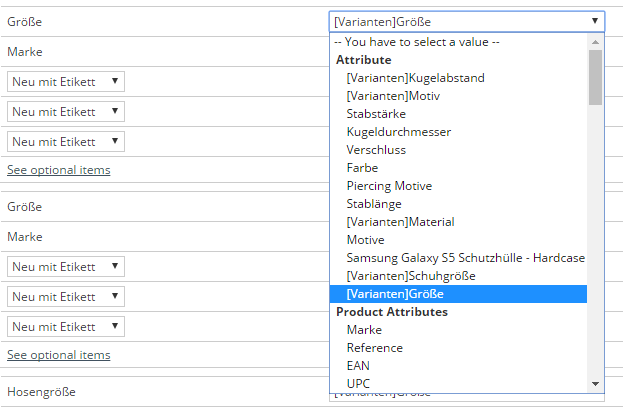Gohan Posted November 21, 2016 Author Share Posted November 21, 2016 Aktuell habe ich die gzip von Dir geladen und installiert. Was die Übersetzungen angeht. Achso, verstehe. eBay Modul = 202commerce > 202 hat einfach bestimmte Länder (warum auch immer) ausgegrenzt und jetzt gibt es das deswegen nicht mehr im Prestashop Store? Die scheinen es aber weiter zu entwickeln. Nur Downloaden kann man es nicht :S Naja zum Topic: Ich glaube, dass Problem betrifft nicht Prestashop Selbst. Ich habe bei "Katalog" ja dank deiner Übersetzung den Punkt "Artikelvarianten" und Artikeleigenschaften. Bei Prestashop kann man beides verwenden und es funktioniert auch. Im eBay Modul selbst kann man aber nur einer Kategorie eines von beiden zuweisen. Habe ich also 4 Artikel mit einer Variantengröße und 2 nur mit Größe kann das ja nicht funktionieren. Bei eBay kann man im Modul halt nur "Variantengröße" oder "Größe" auswählen. Wähle ich da also "Variantengröße" als "Größe" dann Synchronisiert er 4 Artikel als Varianten zu eBay. Wähle ich "Größe" als Eigenschaft aus, Synchronisiert er 2 Artikel als einzelne Artikel zu ebay. Beides geht aber nicht. Er meckert dann entweder wegen dem einen oder dem anderen rum. Im Dropdown bei dem Modul sieht es ja so aus: <select name="specific[733]"><option value="">-- You have to select a value --</option> Artikelvarianten <optgroup label="Attribute"> <option value="attr-12">[Varianten]Motiv</option> <option value="attr-13">Stabstärke</option> <option value="attr-14">Kugeldurchmesser</option> <option value="attr-15">Verschluss</option> <option value="attr-16">Farbe</option> <option value="attr-17">Piercing Motive</option> <option value="attr-18">Stablänge</option> <option value="attr-19">[Varianten]Material</option> <option value="attr-20">Motive</option> <option value="attr-22">[Varianten]Schuhgröße</option> <option value="attr-23" selected="">[Varianten]Größe</option> </optgroup> <optgroup label="Product Attributes"> <option value="brand-1">Marke</option> <option value="reference-1">Reference</option> <option value="ean-1">EAN</option> <option value="upc-1">UPC</option> </optgroup> Artikeleigenschaften <optgroup label="Merkmale"> <option value="feat-21">Gesamtlänge</option> <option value="feat-22">Farbe</option> <option value="feat-23">Material</option> <option value="feat-24">Marke</option> <option value="feat-25">Schuhgröße</option> <option value="feat-26">Obermaterial</option> <option value="feat-27">Innenmaterial</option> <option value="feat-28">Sohle</option> <option value="feat-29">Style</option> <option value="feat-31">Größe</option> <option value="feat-33">Stil</option> <option value="feat-35">Muster</option> <option value="feat-36">Slip-Art</option> <option value="feat-37">Ausschnitt</option> <option value="feat-38">Verschluss</option> </optgroup> <optgroup label="eBay-Spezifikationen"> <option value="spec-78558">2XS</option> <option value="spec-78559">XS</option> <option value="spec-78560">S</option> <option value="spec-78561">M</option> <option value="spec-78562">L</option> <option value="spec-78563">XL</option> <option value="spec-78564">2XL</option> <option value="spec-78565">3XL</option> <option value="spec-78566">4XL</option> <option value="spec-78567">32</option> <option value="spec-78568">34</option> <option value="spec-78569">36</option> <option value="spec-78570">38</option> <option value="spec-78571">40</option> <option value="spec-78572">42</option> <option value="spec-78573">44</option> <option value="spec-78574">46</option> <option value="spec-78575">48</option> <option value="spec-78576">50</option> <option value="spec-78577">52</option> <option value="spec-78578">54</option> <option value="spec-78579">56</option> <option value="spec-78580">58</option> <option value="spec-78581">60</option> <option value="spec-78582">62</option> <option value="spec-78583">64</option> <option value="spec-78584">16</option> <option value="spec-78585">17</option> <option value="spec-78586">18</option> <option value="spec-78587">19</option> <option value="spec-78588">20</option> <option value="spec-78589">21</option> <option value="spec-78590">22</option> <option value="spec-78591">23</option> <option value="spec-78592">24</option> <option value="spec-78593">25</option> <option value="spec-78594">26</option> <option value="spec-78595">27</option> <option value="spec-78596">28</option> <option value="spec-78597">29</option> <option value="spec-78598">30</option> <option value="spec-78599">31</option> <option value="spec-78600">68</option> <option value="spec-78601">72</option> <option value="spec-78602">76</option> <option value="spec-78603">80</option> <option value="spec-78604">84</option> <option value="spec-78605">88</option> <option value="spec-78606">92</option> <option value="spec-78607">96</option> <option value="spec-78608">100</option> <option value="spec-78609">104</option> <option value="spec-78610">108</option> <option value="spec-78611">112</option> <option value="spec-78612">116</option> <option value="spec-78613">120</option> <option value="spec-78614">124</option> <option value="spec-585407">5XL</option> <option value="spec-585408">6XL</option> <option value="spec-585409">7XL</option> <option value="spec-585410">8XL</option> <option value="spec-585411">9XL</option> <option value="spec-585412">10XL</option> <option value="spec-608308">66</option> <option value="spec-608309">33</option> <option value="spec-608310">128</option> <option value="spec-608311">132</option> <option value="spec-608312">136</option> </optgroup> </select> Das sieht im Modul so aus: Beides geht nicht :S Ich kann auch nicht einfach Artikel in Varianten ändern, das unterstützt eBay nicht. Eieiei, durch deren Streitigkeiten bin ich als Händler der auf Prestashop vertraute wirklich in die Enge getrieben. Das ist mist. Eine Alternative gibt es ja quasi auch nicht, wenn man nicht diese utopischen 300€ für dieses andere Modul ausgibt. Das grenzt schon an Wuc