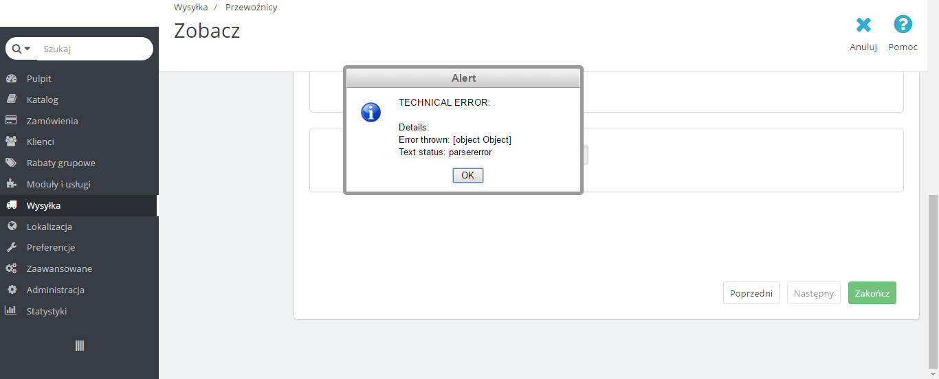 Problem podczas dodawania rodzajów przesyłki