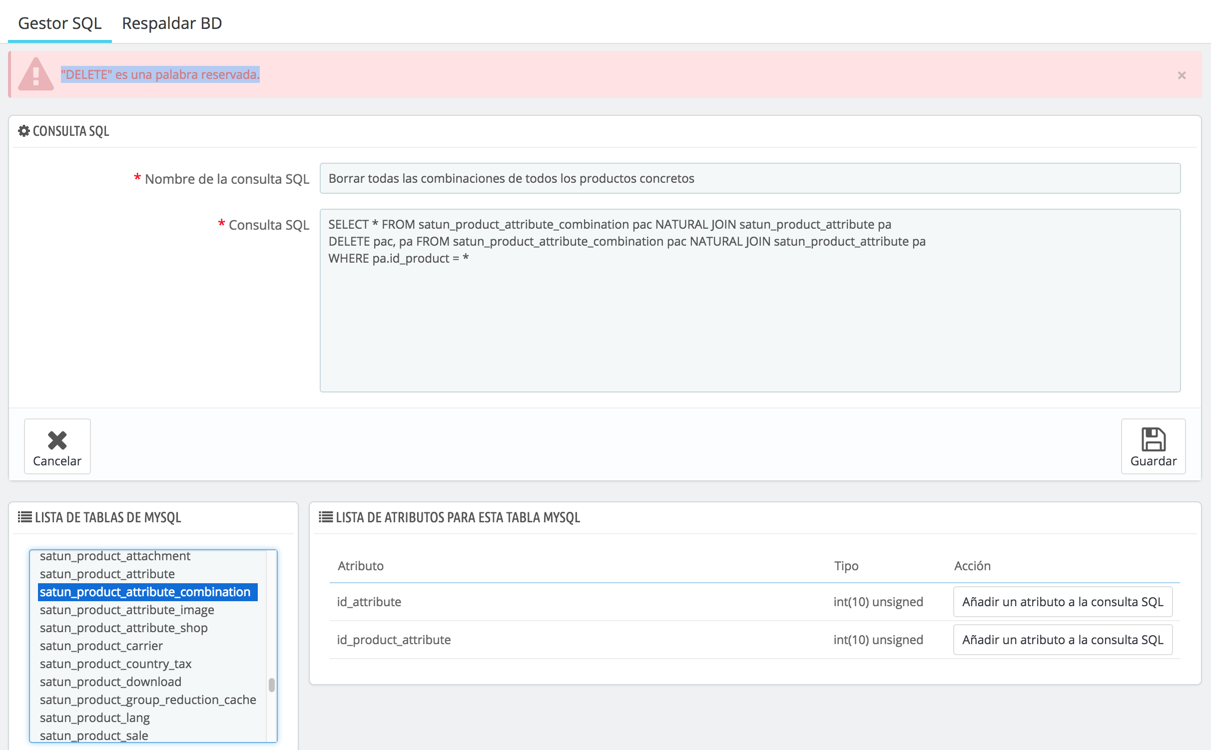 estorde Posted October 16, 2018 Share Posted October 16, 2018 Buenas, He encontrado este hilo, tratando de encontrar una solución para Borrar todas las combinaciones de todos los productos. SELECT * FROM satun_product_attribute_combination pac NATURAL JOIN satun_product_attribute pa DELETE pac, pa FROM satun_product_attribute_combination pac NATURAL JOIN satun_product_attribute pa WHERE pa.id_product = * Sin embargo al intentar realizar la siguiente consulta SQL en mi Prestashop 1.7.3 me sale el siguiente error:"DELETE" es una palabra reservada. Seguro que estaré escribiendo algo mal en la orden, porque mis conocimientos de SQL son limitados. Alguien podría ayudarme a crear la orden correcta para poder borrar todas las combinaciones y dejar todos mis productos como productos simples por favor? En realidad los productos son simples, pero de alguna manera al importarlos de manera masiva en la nueva instalación de PS los ha traído con la casilla de Producto con combinaciones activada y es lo que quiero corregir. Muchas gracias Link to comment Share on other sites More sharing options...