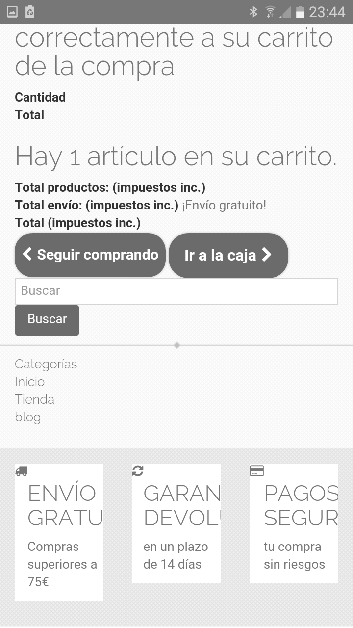 tribalsiete Posted November 28, 2016 Share Posted November 28, 2016 Buenas noches, espero que alguien me ayude.Estoy teniendo un problema con mi plantilla en la versión móvil. Uso plantilla CARME y esta tarde estuve experimentando a cambiar el carrito de sitio y ponerlo en el menu horizontal superior creando una nueva categoría dentro del módulo. No me gustó como quedaba y tampoco supe cambiarlo, así que decidí dejarlo todo como estaba. El problema es que ahora en la versión móvil y en la url de inicio me sale el carrito por encima de toda la plantilla. Incluso a perdido casi que toda la configuración que tenia anteriormente, cambio de color las letras y hay un enorme espacio en blanco justo a la derecha. Probé a reinstalar el menú horizontal y nada, probé a reinstalar el carrito y creo que allí está el problema, pero no sé como solucionarlo. Si alguien puede ayudar se lo agradecía en el alma. Os adjunto la versión pc y la versión móvil para que se vea la diferencia. En el pc se visualiza la plantilla sin problemas. Link to comment Share on other sites More sharing options...
