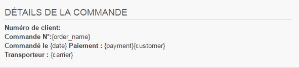 Saguait Posted November 29, 2016 Share Posted November 29, 2016 (edited) Bonjour tout le monde, j'espère que vous allez bien. Je viens vous demander de l'aide car je ne trouve pas une variable qui permet d'afficher le numéro de client dans une confirmation de commande Je vous mets un petit screen pour que vous pussiez avoir une idée. J'ai essayé différente variable comme {id_customer} {customer_id} {id.customer}{client.ID} et en remplaçant customer par client mais aucune ne fonctionne. Merci pour votre aide. Edited November 29, 2016 by Saguait (see edit history) Link to comment Share on other sites More sharing options...