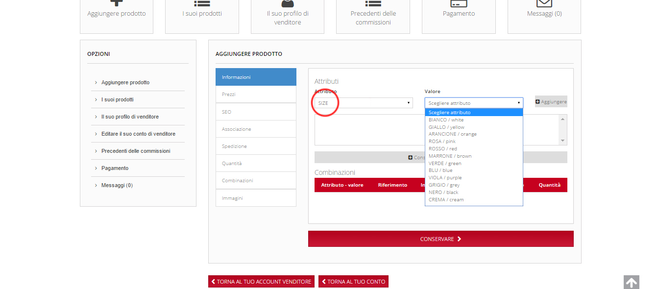 Se provo ad aggiungere il colore, visto che è l'unico attributo che mi fa vedere i valori, comunque non l'aggiunge alle combinazioni, come se non funzionasse il tasto aggiungi combinazione.