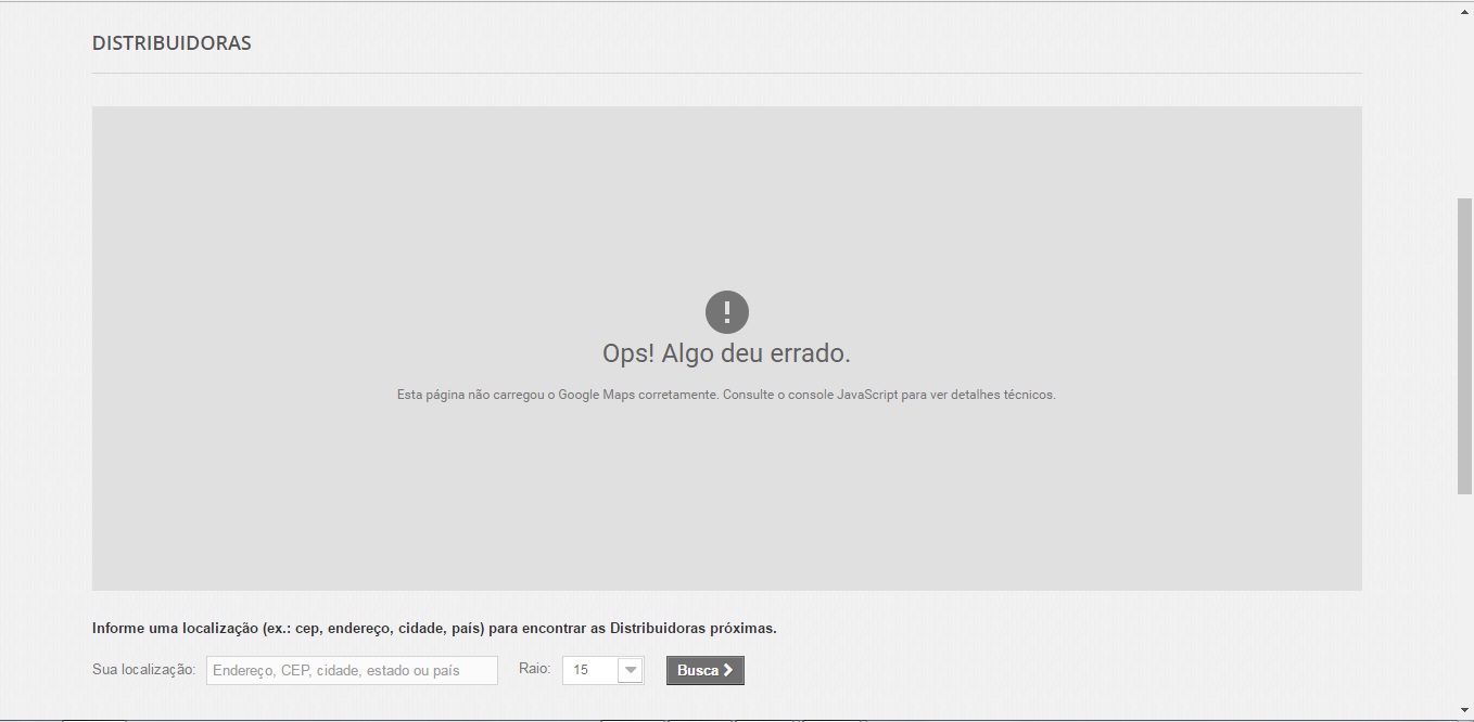 Carlos-JCP Posted November 30, 2016 Share Posted November 30, 2016 Boa tarde a todos! Ao acessar a página distribuidoras, eis que surge a seguinte mensagem de erro: Ops! Algo deu errado. Esta página não carregou o Google Maps corretamente. Consulte o console JavaScript para ver detalhes técnicos. Eu já atualizei o Java para a Versão 8 upadate 111 e também os navegadores Chrome e Firefox, mas não resolveu. Alguém sabe como corrigir? Link to comment Share on other sites More sharing options...