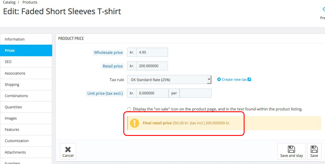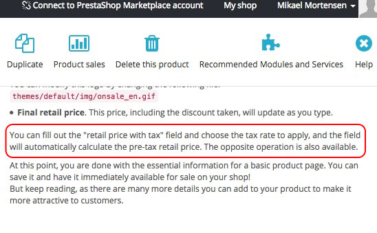 Mikael Mortensen Posted December 2, 2016 Share Posted December 2, 2016 (edited) Hi Prestashoppers, I have a problem with my Prestashop 1.6.1.6: When I make a new product, I would like to be able to submit the product price as "Final retail price with tax". I can not see how to do this, and can not find any add-ons that solve the problem. I have attached pictures of my shop when pricing a product. And also a picture of the Help menu, where it is stated, that it is possible to fill out the "retail price with tax". But how do I do that? Can anyone help? Best regards and thanks for helping, Mikael Edited December 20, 2016 by [email protected] (see edit history) Link to comment Share on other sites More sharing options...