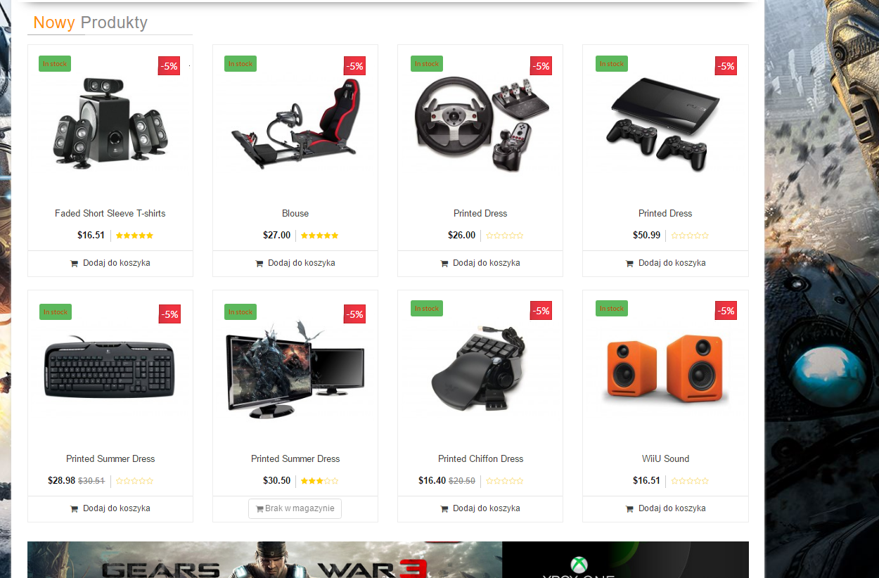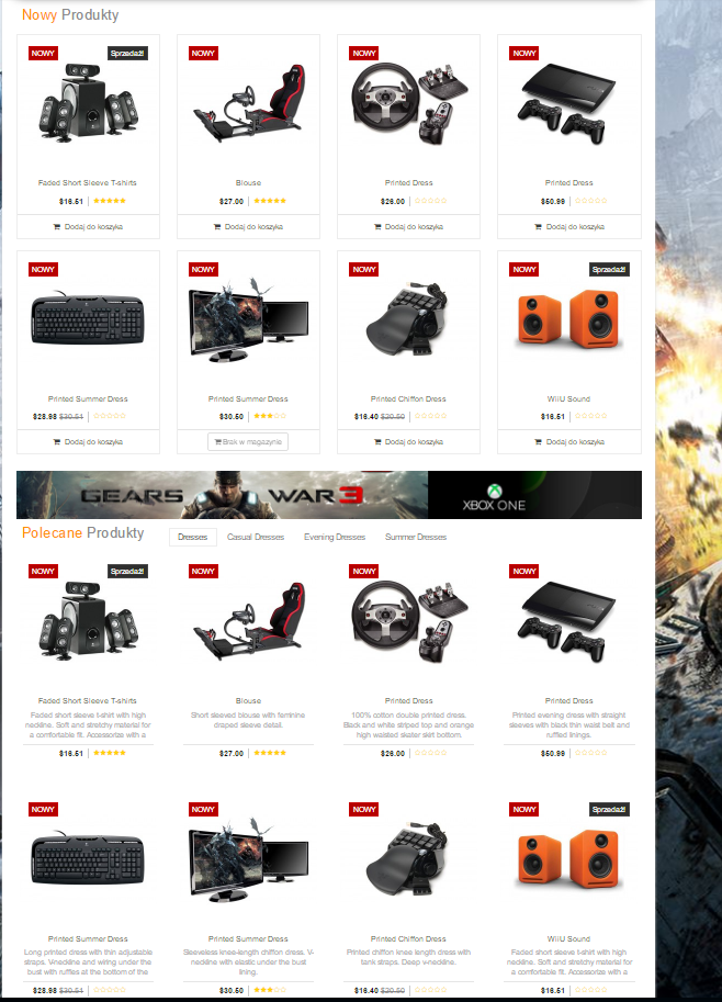 Chodzi tutaj o zmianę wizualną jeżeli chodzi o listę produktów - chciałbym aby wszędzie był wygląd początkowy ( przed najechaniem myszką ) taki jak w nowych produktach czyli ramka dookoła cena i dodaj do koszyka ( bo w innych polecanych czy podobnych jest wgl inaczej a chciałbym zachować styl - na demie widać są to oddzielne karty i chciałbym tak w każdej tabeli produktów ) oraz dodatkowo zależ mi aby prostokąt na zdjęciach "Nowy" był wymieniony na status dostępności czyli wiadomo jasny jak jest i napis Dostępny a jak nie ma czerwony i nie dostępny ( ew. jak chociaż sam napis nowy zmienić i kolor tego prostokąta? jak dokonać ). A po drugiej stronie gdzie jest "Sprzedaż " czy tam " Wyprzedaż " nie raz to jak ustawić aby po prostu jak w innych sklepach była tam okrągła informacja lub tak jak teraz ale z Przeceną produktu czyli np. -10% -33% itd?? obojętnie może być prostokąt jak teraz lub kółko i kolor czerwony.