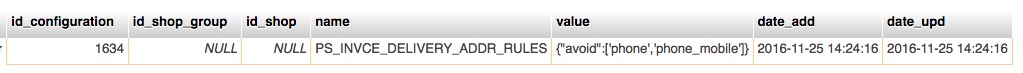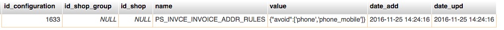 IED Factory Posted December 8, 2016 Author Share Posted December 8, 2016 Merci Eolia pour ce retour très pointu. J'ai donc fait ce que vous préconisez, rien ne fonctionne, j'ai toujours le numéro de téléphone mobile dans l'adresse de mon client sur sa facture... Par contre id_shop_group et id_shop sont en NULL, cela est peut-êre lié : voir captures Link to comment Share on other sites More sharing options...