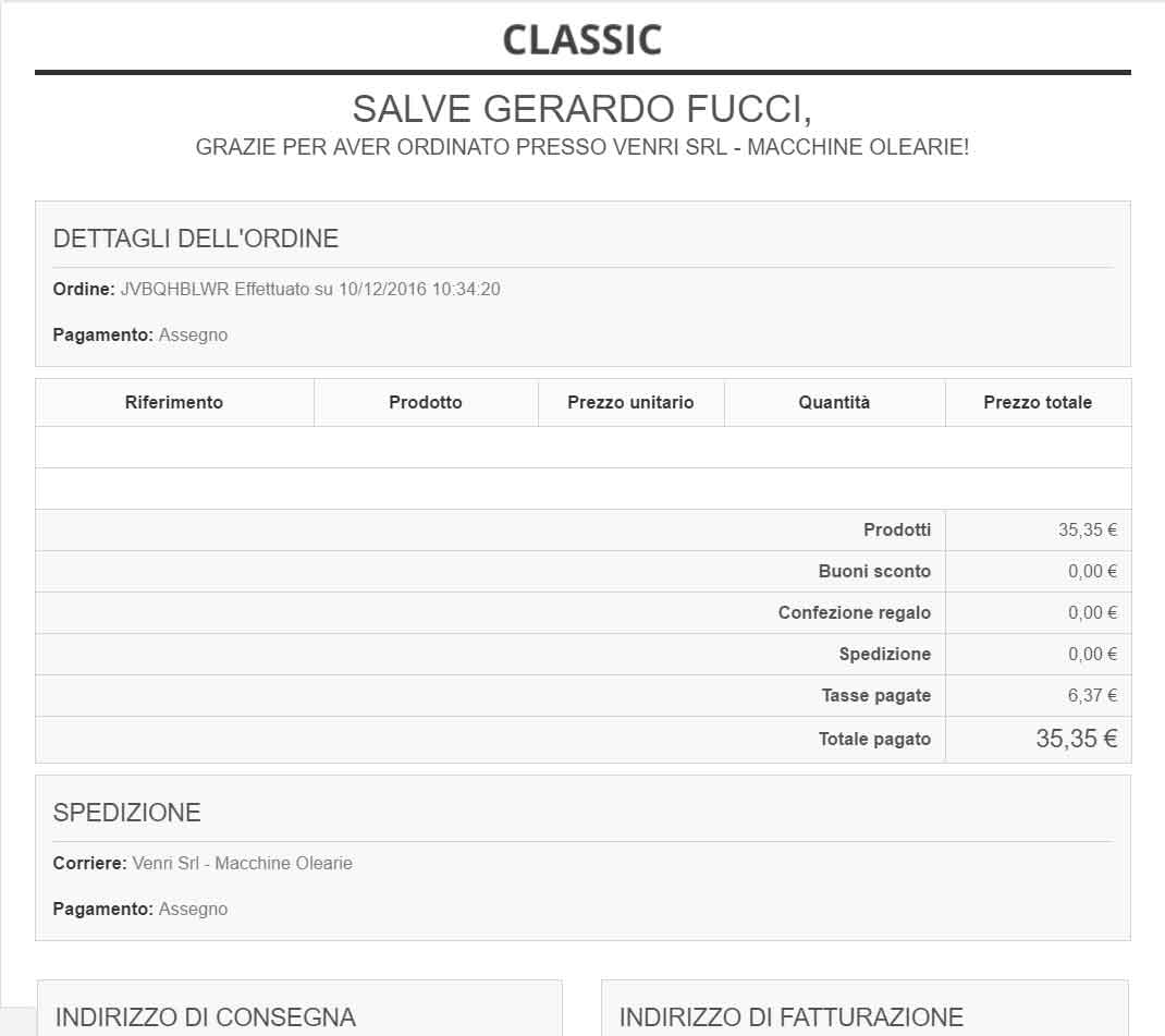 gerryfu Posted December 10, 2016 Author Share Posted December 10, 2016 (edited) Ho fatto una prova installando in una cartella pulita la versione 1.7.0.2, ho fatto una simulazione di pagamento ed accade la stessa cosa, nella mail conferma ordine non vengono visualizzati i dettagli di ogni singolo prodotto... Domanda è un problema del mio server? oppure è un bug di prestashop? Dovrebbe essere una funzione di default, quindi non penso di chiedere tanto se chiedo aiuto! Dal momento che non ricevo nessuna risposta... Grazie! Edited December 10, 2016 by gerryfu (see edit history) Link to comment Share on other sites More sharing options...