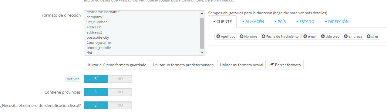 lk2_89 Posted December 12, 2016 Author Share Posted December 12, 2016 (edited) Para ver si alguien entiende porque no me pide el DNI en el registro, adjunto imágenes siguiendo el procedimiento indicado por @shacker al principio de este tema. En el BO, me voy a Localización > Países y filtro para que me salga España, donde le doy a Modificar (imagen1). Dentro, en "Formato de dirección", añado DNI desde la ficha "Dirección" (imagen2). Me aseguro que el campo "¿Necesita el nº de identificación fiscal?" esté marcado y le doy a "Guardar". Pero cuando voy a un nuevo registro, sigue sin pedírmelo. La dirección de registro en mi tienda es la siguiente: http://shishatime2.es/inicio-sesion?back=my-account#account-creation PDta: adjunto dos imágenes para que veáis el proceso. Edited December 12, 2016 by lk2_89 (see edit history) Link to comment Share on other sites More sharing options...
