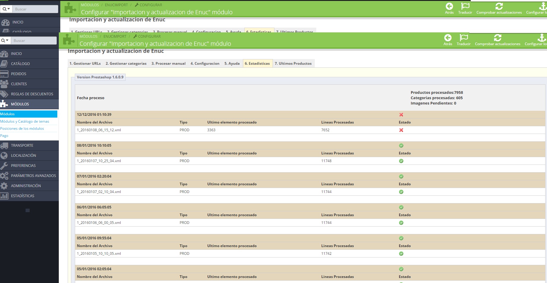 Duby Posted December 12, 2016 Share Posted December 12, 2016 Buenas noches. Hace un tiempo compre un modulo de importación automática csv de mi distribuidor + instalación. El caso es que me acabo de dar cuenta que desde hace unas semanas no está subiendo ni actualizando productos!. No tengo productos en la pestaña novedades porque no se suben productos nuevos. Tenéis idea de qué ha podido pasar?. Al mínimo cambio que intento realizar en el módulo me aparece errores tipo como el de la primera imagen.(ver mensaje adjunta) Pongo unas capturas del módulo. Ojalá puedan ayudarme. Gracias. Link to comment Share on other sites More sharing options...