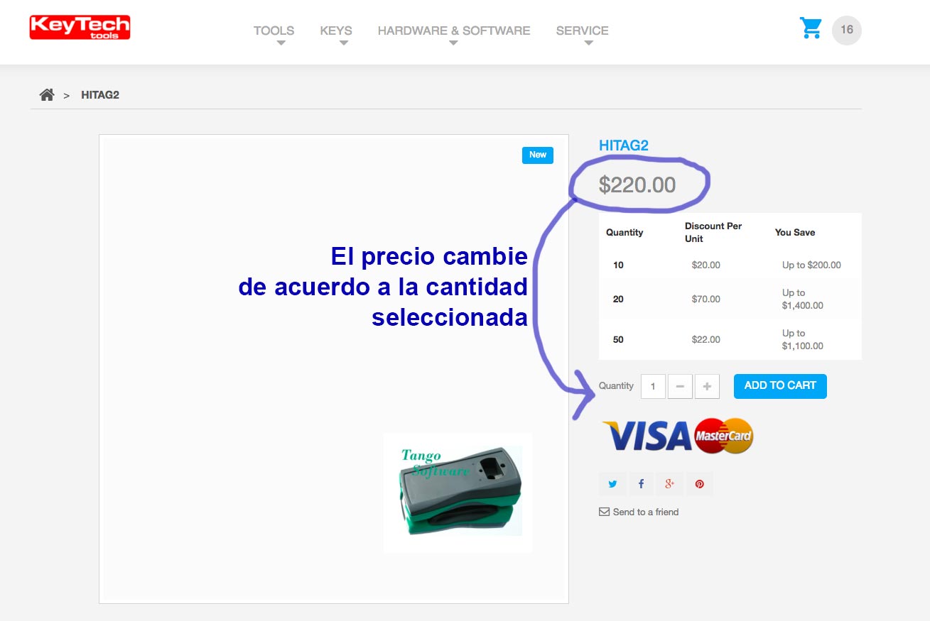 Me gustaría que este precio se viera reflejado o cambiara al momento de seleccionar la cantidad de productos, esta propiedad funciona en la página de check out de mi tienda, pero no esta disponible en la página del producto.