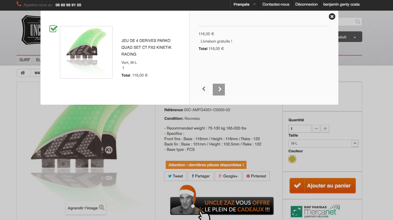 BenGC Posted December 14, 2016 Share Posted December 14, 2016 Bonjour, lors de l'ajout d'un produit au panier la pop panier s'ouvre mais il manque les infos "continuer mes achats" et "commander". (screen shot inclu) j'ai testé avec d'autres navigateurs et en clerant le cache mais toujours rien. je suis sous prest 1.6.0.11 et notre site est www.unclezaz.com Merci d'avance de votre aide précieuse benjamin Link to comment Share on other sites More sharing options...
