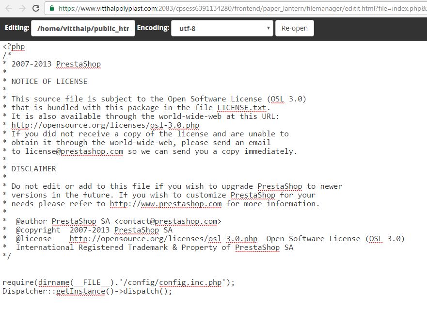 Vitthal Posted December 15, 2016 Share Posted December 15, 2016 Dear Sir We are, www.vitthalpolyplast.com Pls permit for index.php file for editing. We need to update our site design, layout, image etc. Pls support. Reply on: [email protected] Thanks.Regards.. for, Vitthal Polyplast ====================================================================== <?php /* * 2007-2013 PrestaShop * * NOTICE OF LICENSE * * This source file is subject to the Open Software License (OSL 3.0) * that is bundled with this package in the file LICENSE.txt. * It is also available through the world-wide-web at this URL: * http://opensource.org/licenses/osl-3.0.php * If you did not receive a copy of the license and are unable to * obtain it through the world-wide-web, please send an email * to [email protected] so we can send you a copy immediately. * * DISCLAIMER * * Do not edit or add to this file if you wish to upgrade PrestaShop to newer * versions in the future. If you wish to customize PrestaShop for your * needs please refer to http://www.prestashop.com for more information. * * @author PrestaShop SA <[email protected]> * @copyright 2007-2013 PrestaShop SA * @license http://opensource.org/licenses/osl-3.0.php Open Software License (OSL 3.0) * International Registered Trademark & Property of PrestaShop SA */ require(dirname(__FILE__).'/config/config.inc.php'); Dispatcher::getInstance()->dispatch(); Link to comment Share on other sites More sharing options...