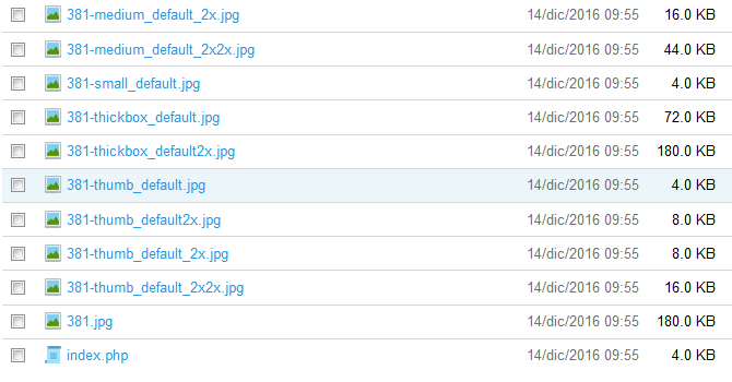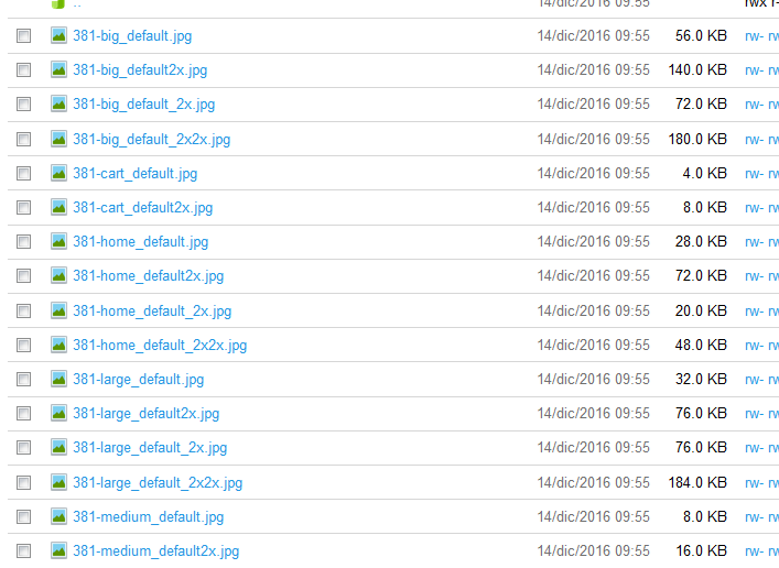 [email protected] Posted December 15, 2016 Share Posted December 15, 2016 (edited) Buenos días, Estoy usando prestashop 1.6.1.9 y desde un tiempo a ahora me he dado cuenta que cuando cargo una imagen de producto, en vez de crear en el servidor sólo las 14 miniaturas que tengo definidas para Producto en el apartado Preferencias>Imagenes (imagen adjunta) crea en la carpeta de cada nueva imagen un total de 28 imágenes (imagenes adjuntas). También tengo problemas a la hora de borrar estas imagenes desde Prestashop, ya que en vez de borrar todas las imagenes generadas sólo está borrando las 14 que tengo definidas en Preferencias>Imagenes y deja sin borrar las que no debería haber creado, por lo que estoy ocupando espacio innecesario del servidor. ¿Alguien sabría decirme que proceso/procesos es el que realiza la carga de las imagenes para poder revisarlo y ver a qué es debido que esté generando todas estas imagenes extra? Saludos y gracias de antemano! Edited December 20, 2016 by [email protected] (see edit history) Link to comment Share on other sites More sharing options...