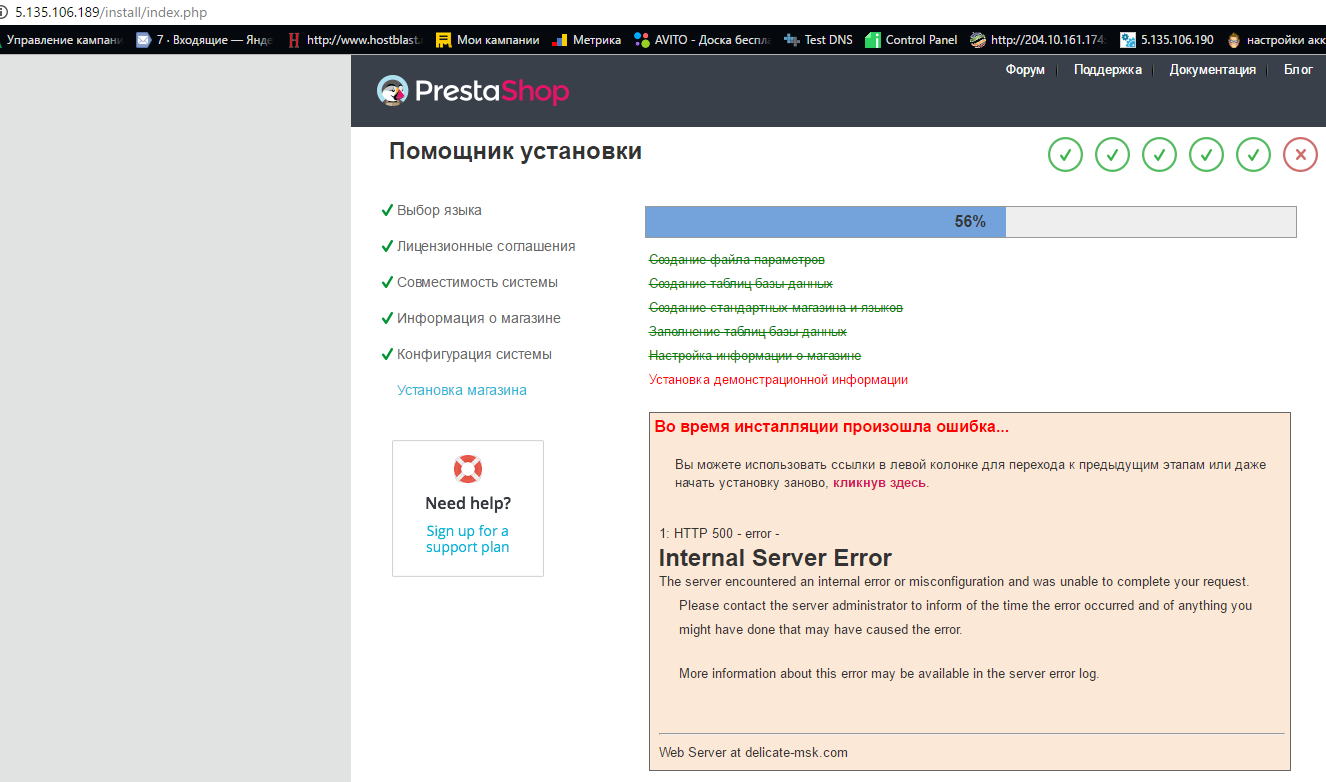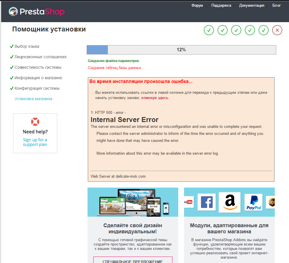 alexhelp Posted December 17, 2016 Share Posted December 17, 2016 Купил VPS и пытаюсь установить PrestaShop 1.6 или 1.7 Смена версии PHP не привело к результату. Вот такое пишет = 1: HTTP 500 - error - Internal Server Error The server encountered an internal error or misconfiguration and was unable to complete your request. Please contact the server administrator to inform of the time the error occurred and of anything you might have done that may have caused the error. More information about this error may be available in the server error log. Web Server at delicate-msk.com или An error occurred during installation... You can use the links on the left column to go back to the previous steps, or restart the installation process by clicking here. 1: HTTP 502 - error - 502 Bad Gateway Помогите, подскажите кто может! Link to comment Share on other sites More sharing options...