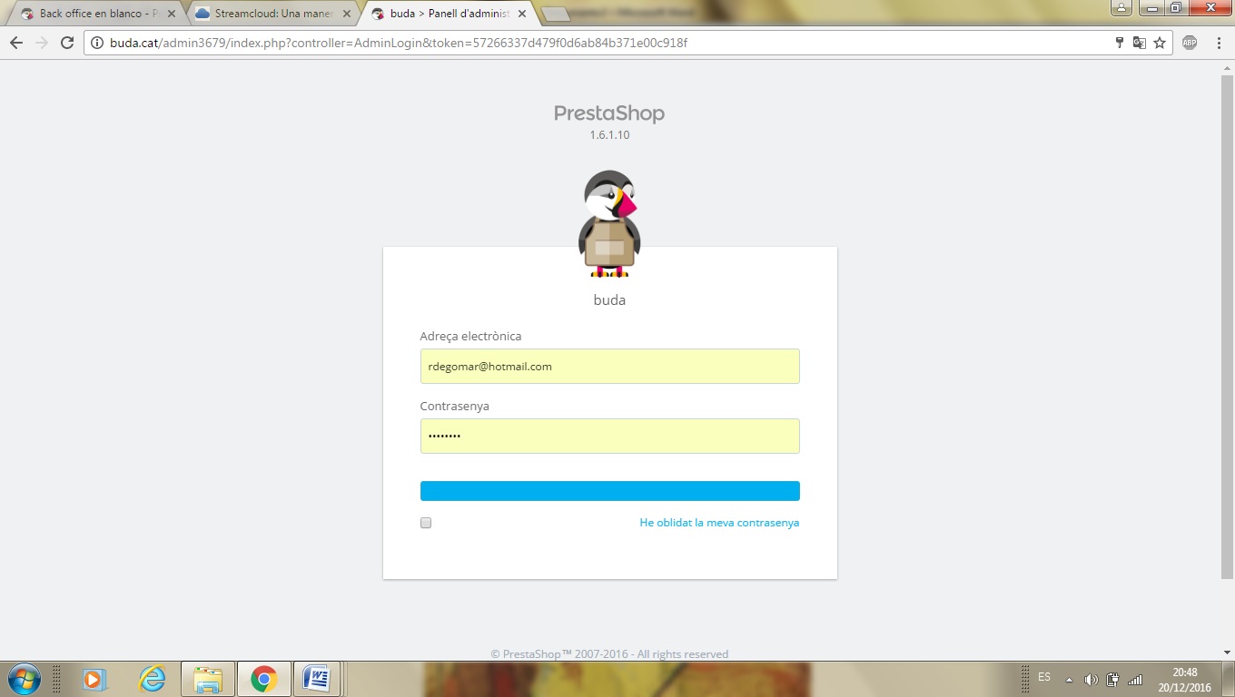 nadie Posted December 21, 2016 Share Posted December 21, 2016 nada... navegación privada igual... de verdad no entiendo nada ostras,,, perdona que insista,,, y más contigo que eres un crack en este foro... pero echale un vistazo a la foto que adjunto y dime si te salen a ti las palabras que te he subrayado... imagen correcta de otra web.jpg de los nervios ya me dejo hasta la imagen... aqui va Nadie, por si te sirve de ayuda para a tu vez... ayudarme,,, cuando le doy a la casilla... he olvidado mi contraseña... introduzco el mail y me sale el mensaje que mi nueva contraseña se ha enviado a mi mail... aunque nunca llega a mi mail. Posteriormente tengo que regenerar mi contraseña a través del procedimiento habitual de config- y de phpmyadmin -ps_employed. A ver, que acabo de volver a mirar login al panel, y ahora si aparece la pantalla del login "mal". (Y con el debug activado dices que aparece igual -__-) Deduzco que no tienes ningun errorlog generado para tener mas pistas del fallo ¿no? PD: Yo llevo inactivo de este mundo hace 3 años, solo me he pasado esta semana para actualizar los indice de los modulos gratuitos, pero que ya no toco prestashop desde hace 3 años, deje ese mudillo. Link to comment Share on other sites More sharing options...