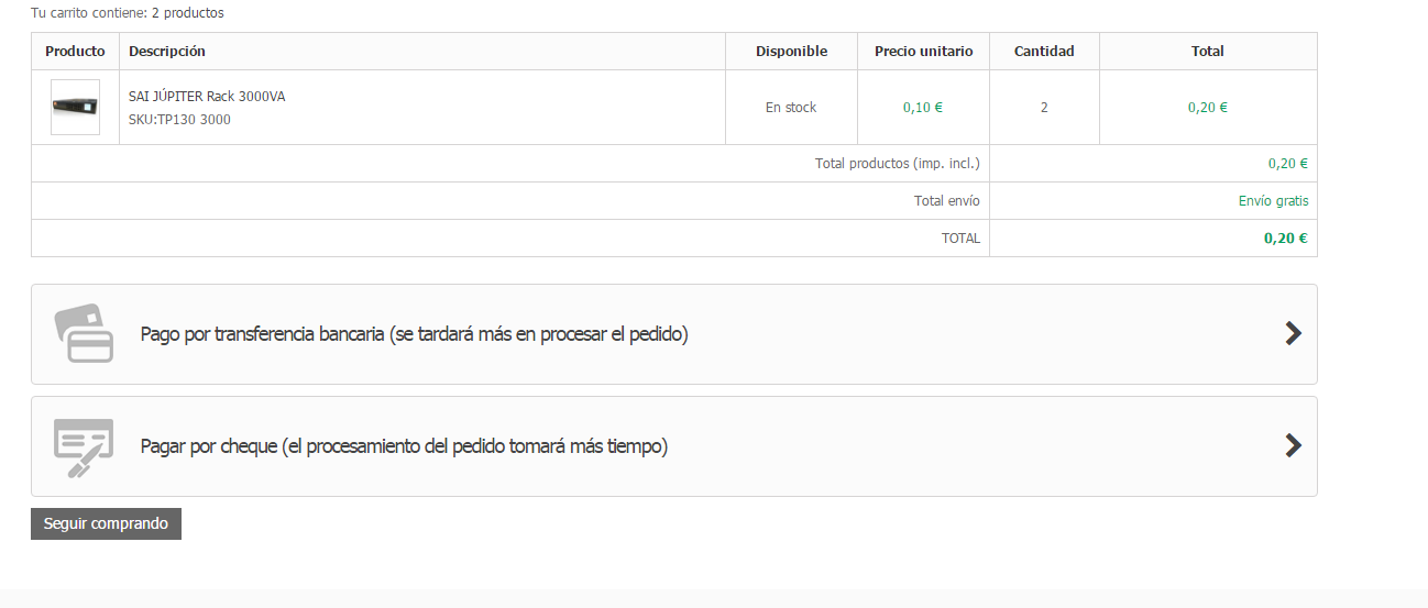 acabo de instalar el módulo gratuito de Redsys en una de mis tiendas. Consigo configurarlo con el entorno de prueba como ellos me han pedido, pero si intento simular un pedido para hacer una prueba, no me sale el módulo de pago con tarjeta... ¿Alguien puede ayudarme?