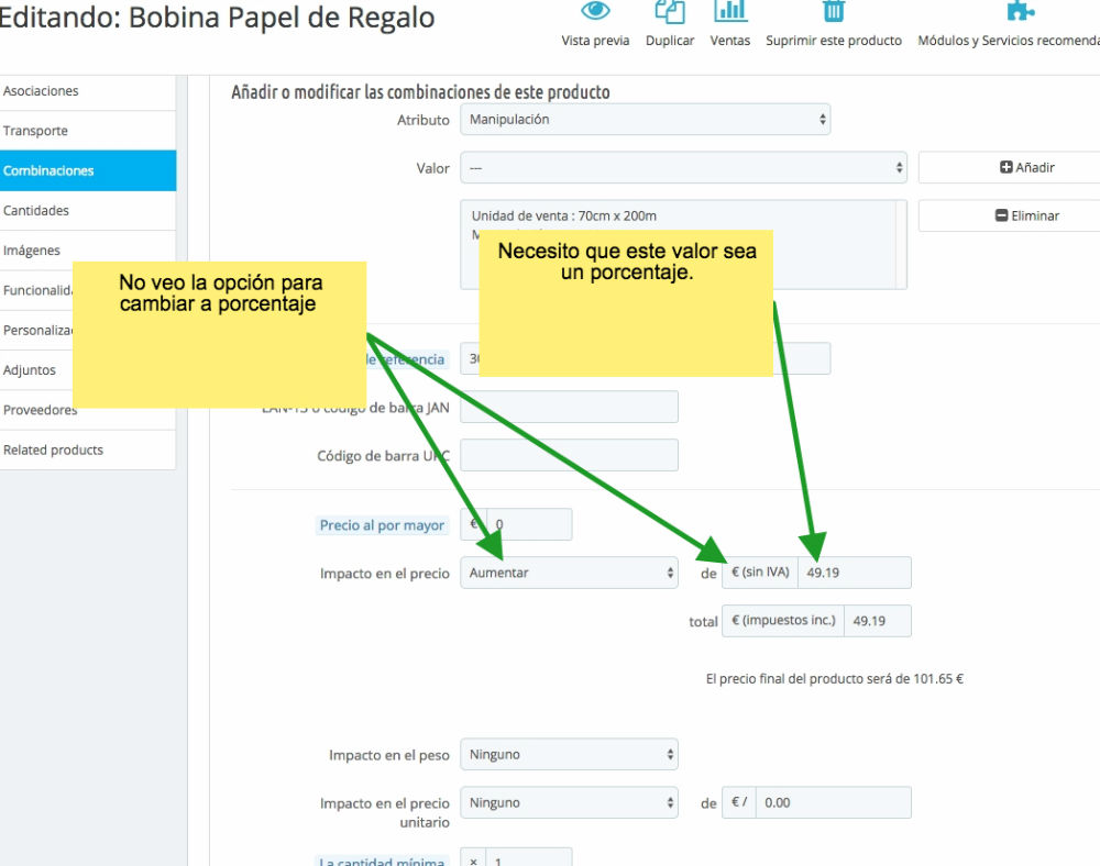 canelones Posted December 21, 2016 Share Posted December 21, 2016 (edited) Hola, Estoy intentando crear una combinación con un precio que tenga un aumento de 10% sobre el precio base del producto. Creo recordar que había una opción para que este impacto sea un valor absoluto como por ej.: 6€ o un porcentaje como por ej.: 10%. El problema es que no veo como hacerlo con porcentaje. Subo una captura. Debo activar esto en algún sitio. Edited December 21, 2016 by canelones (see edit history) Link to comment Share on other sites More sharing options...