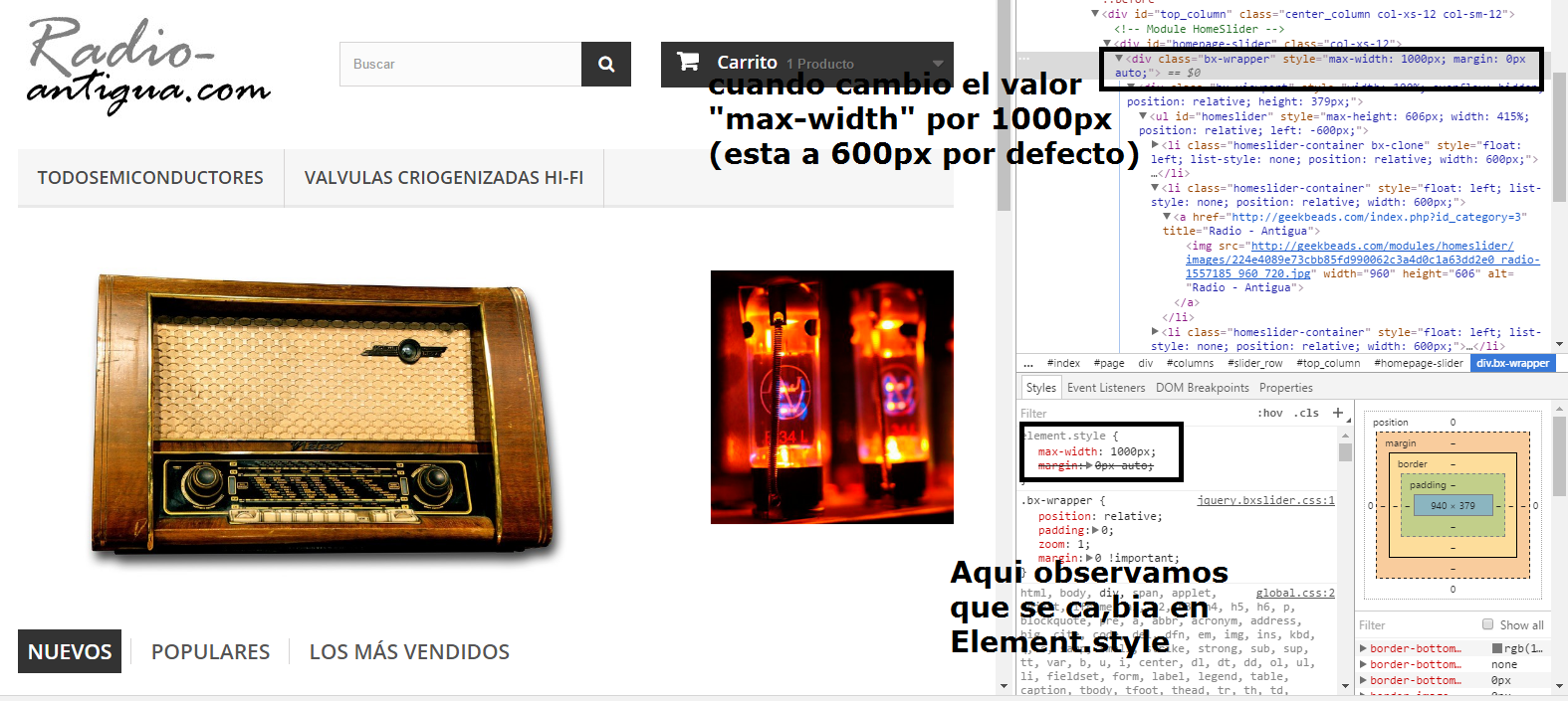 puchesub Posted December 22, 2016 Share Posted December 22, 2016 Buenos dias. Estoy intentando modificar el Slidear mi web (www.geekbeaks,com) y tras mucho tocar el css del modulo, me he dado cuenta que lo que necesito tocar (ver el slidear a lo largo) esta en "element.style", que si no me equivoco, es HTML, no CSS. Se que las imagenes actuales no cumplen con las medidas necesarias para 1000px, pero son de pruebas. Ya he probado con una imagen hecha con Photoshop a 1000px y el modulo la reescala a 600px (configuracion por defecto). Adjunto Capturas de pantalla para que comprendáis la idea. Muchas Gracias. Link to comment Share on other sites More sharing options...