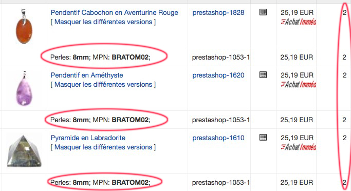sehp Posted December 23, 2016 Share Posted December 23, 2016 Bonjour, Le support de 202-commerce tardant à trouver le problème je me décide à poster au cas ou quelqu'un aurait déjà eu ce bug . Quand une commande comportant au moins 1 article avec des déclinaisons est passée sur ma boutique, le module ebay met fin aux annonces sur ma boutique ebay concernant les articles qui ont un stock "0" suite à la commande, en revanche il recréer par la suite des annonces correspondantes aux articles de la dite commande avec pour chaque annonce des déclinaisons correspondantes aux déclinaisons de l'article vendu sur ma boutique et un prix qui n'a rien à voir. Vous pouvez voir sur les captures d’écran que le module créer des ventes d’articles déjà vendus et supprimés avec le référence et la déclinaison d’un autre article faisant parti de la commande.. Et si quelqu'un a une solution aussi pour la lenteur de ce module qui fait ramer le backoffice et le site ce serait cool! Merci pour votre aide Link to comment Share on other sites More sharing options...