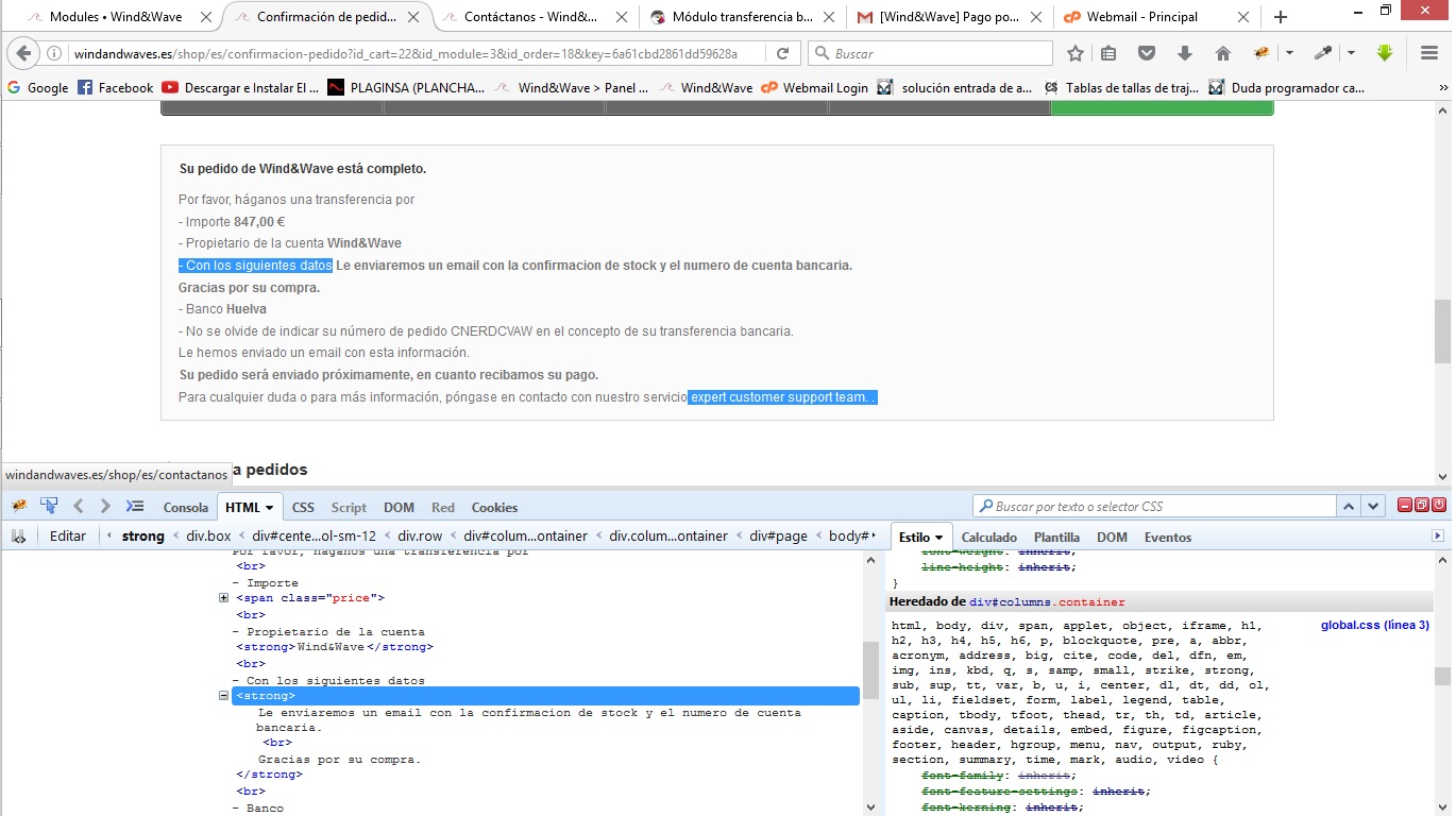 nadie Posted December 26, 2016 Share Posted December 26, 2016 ¿Has intentando en la pestaña Localización -> Traducciones -> Modificar Traducciones -> Traducciones de los módulos? Bloque: Módulo bankwire ? Me refiero, que habitualmente en "Traducciones de los módulos" ( Localización -> Traducciones -> Modificar Traducciones -> Traducciones de los módulos -> Bloque Bankwire (ese pantallazo que adjuntas creo que es DEFAULT-BOOTSTRAP - PAYMENT_RETURN del bankwire) puedo cambiar los textos generales de ese modulo, y lógicamente los datos como el propietario de la cuenta, detalles y dirección descursal de la bancaria, los cambias en la configuración del módulo "Transferencia Bancaria" desde la pestaña Módulos -> Módulos Por otro lado, tambien puedes cambiar traducciones del modulo en el fichero *.php del modulo: modules/bankwire/es.php /themes/default-bootstrap/modules/bankwire/es.php Lo que no tienes que tocar son los "tpls" para cambiar las traducciones /themes/default-bootstrap/modules/bankwire/views/templates Link to comment Share on other sites More sharing options...
