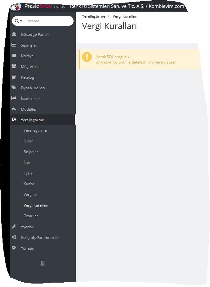 safa Posted December 26, 2016 Share Posted December 26, 2016 Merhaba, https://www.prestashop.com/forums/topic/269837-editing-tax-rule-getting-error-bad-sql-query-column-name-in-where-clause-is-ambiguous/?p=1959194 böyle bir çözüm buldum veritabanınızı yedekledikten sonra bir deneyin isterseniz. Link to comment Share on other sites More sharing options...