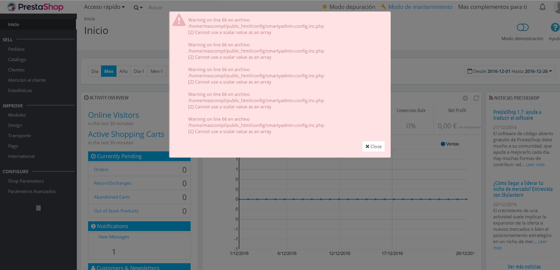 emilio19 Posted December 26, 2016 Share Posted December 26, 2016 Buenos días compañeros, tengo unos cuantos errores en mi prestashop (1.7.0.2). Los podeis ver en el archivo adjunto. Hace una semana puse un tema en este foro pues me salía un error en atributos, os dejo el enlace: https://www.prestashop.com/forums/topic/582188-http-error-500/?view=getnewpost Como puse la tienda en modo depuración para ver los errores, me sale ese error cada vez que inicio sesión en mi back office, y no se qué errores son y como solucionarlos. Espero que me podáis ayudar, gracias!! Link to comment Share on other sites More sharing options...