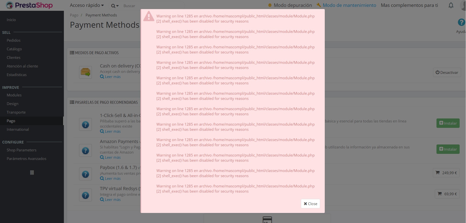 emilio19 Posted December 26, 2016 Author Share Posted December 26, 2016 Me acabo de dar cuenta que en métodos de pago me sale este error, intento actualizar el módulo y me dice que no se puede y que por razones de seguridad el módulo se ha desactivado Link to comment Share on other sites More sharing options...